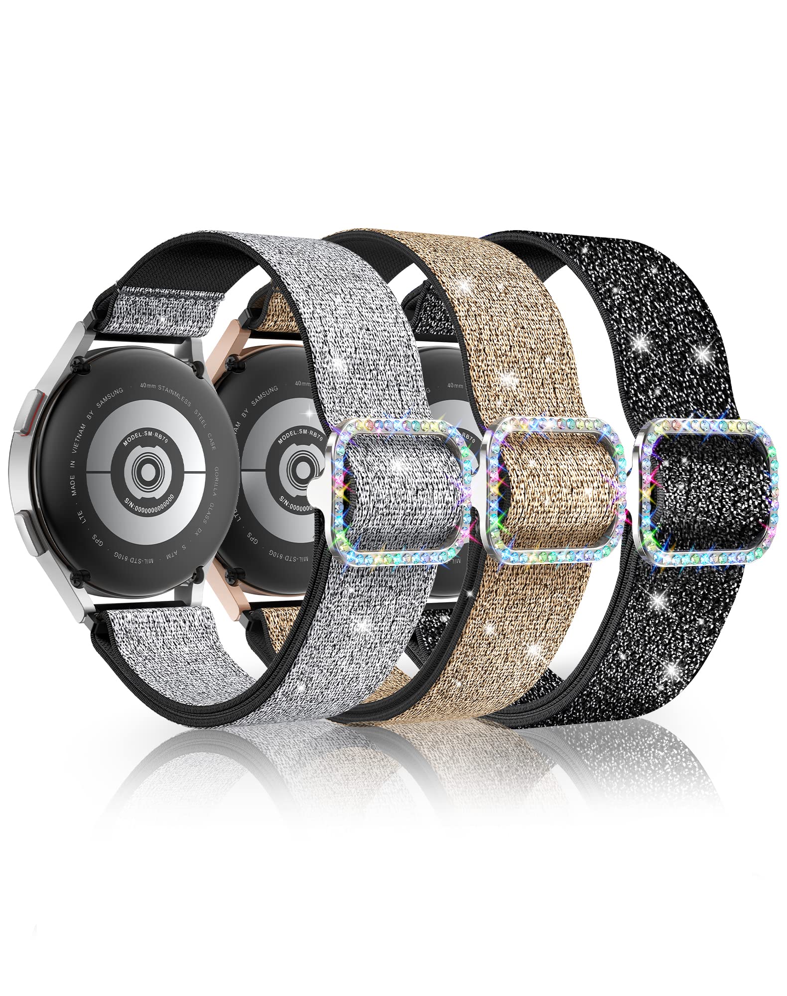Compatible with Most 20mm Galaxy Watch Models: LETOID stretchy watch bands fit Samsung Galaxy Watch 7/6/5/4 (40mm & 44mm), Watch FE (40mm), Watch 5 Pro (45mm), Watch 6 Classic (43mm/47mm), Watch 4 Classic (42mm/46mm), Active 2 (40mm/44mm), Galaxy Watch 3 (41mm), Gear S2, and any smartwatch with 20mm lugs Glamorous Bling with Adjustable Rhinestone Buckle: Each band features a sparkling rhinestone buckle that’s both eye-catching and secure. Easily adjustable for a snug, comfortable fit, the glitter won’t fade or fall off—perfect for women who love fashion with function Premium Stretchy Nylon – Soft, Breathable, and Washable: Made from high-quality elastic braided nylon with metallic thread, these bands are lightweight, skin-friendly, and breathable. No irritation, no stiffness—just all-day comfort Great for All Occasions & Presents: Dress it up or down—these glitter bands are ideal for everything from daily wear to parties, weddings, dates, or holiday celebrations. Makes a thoughtful present for birthdays, Valentine’s Day, Mother’s Day, and more 3-Pack Value & Worry-Free Support: Includes 3 interchangeable glitter bands to match your mood or outfit. Compatible, stylish, and durable. If you need help, our customer support team is here to assist you through Amazon LETOID Premium Stretchy Band Set for Samsung Galaxy Watches Universal Compatibility: Designed for a variety of Samsung Galaxy Watches including models 7, 6, 5, 4 (44mm/40mm), FE 40mm, 5 Pro 45mm, 6 Classic (43mm/47mm), and 4 Classic (46mm/42mm). Also compatible with 20mm lug width watches from brands like Garmin, Amazfit, Gizmo, Gabb, and more. Suitable for wrist sizes ranging from 4.5" to 8.5". Vibrant Style & Comfort: Add a pop of color and sophistication to your wristwear with our 20mm replacement bands. Expertly crafted with a blend of silver wire and cushioned nylon, samsung watch bands are not only stylish but also comfortable for all-day wear. Elegant Design with Rhinestone Buckle: Galaxy watch 7 6 5 4 band feature a dazzling rhinestone-adorned metal buckle that sets them apart from standard options. The elastic strap ensures a secure and effortless fit, while the braided pattern enhances breathability and comfort for any occasion. Glamorous & Versatile: These stretchy galaxy watch 7 6 5 4 bands are perfect for both work and play, adding a touch of elegance to your Samsung Galaxy Watch. They make a thoughtful present for birthdays, holidays, weddings, and other special events, offering a chic alternative to standard silicone straps. Samsung Galaxy Watch Band: Choose LETOID for a combination of glamour and comfort. Package Includes: 3-pack dazzling galaxy watch bands, ready to elevate your style and watch experience.
