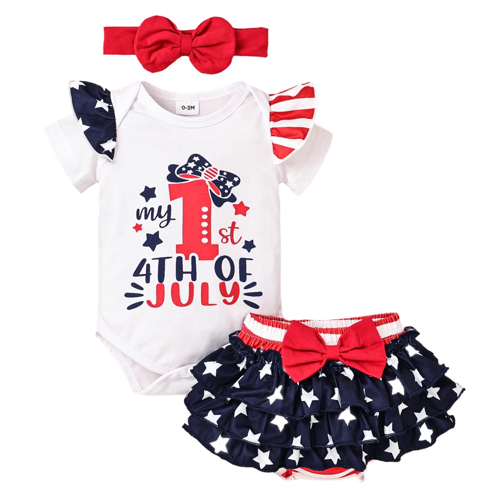 【Soft and Comfortable Fabric】Baby girl 4th of July outfit for girls is crafted from a soft and breathable blend of 95% cotton and 5% Spandex. This ensures a gentle texture against your baby's skin and keeps them fresh and comfortable throughout the day. 【Convenient and Beautiful Design】The 4th of July baby girl outfits feature a sturdy button on the romper, making it convenient for diaper changes. The ruffles on the bloomers and shoulders add a touch of beauty to the outfit, matching with a cute headband, making your little girl looks more adorable, beautiful, and attractive. 【Recommended Age】Suitable for 0-3 months baby girl clothes, 3-6 months baby girl clothes, 6-9 months baby girl clothes, 9-12 months baby girl clothes, and 12 to 18 months girl clothes. They are designed to highlight your beloved baby's beauty at different stages of growth. 【The Perfect Gift】These baby girl clothes are ideal for your baby's daily wear, playtime, outdoor activities, and special occasions like birthday parties, beach games, or photo shoots. The patriotic design makes them especially suitable for ceremonial occasions such as Independence Day, Memorial Day, Veterans Day, or other special festivals. It's a wonderful gift option. 【Package Included】You will get 1 x baby girl romper + 1 x baby girl short pants + 1x cute headband. Please refer to the size information provided below the description to ensure the perfect fit for your little one. ❤️ Features: ❤