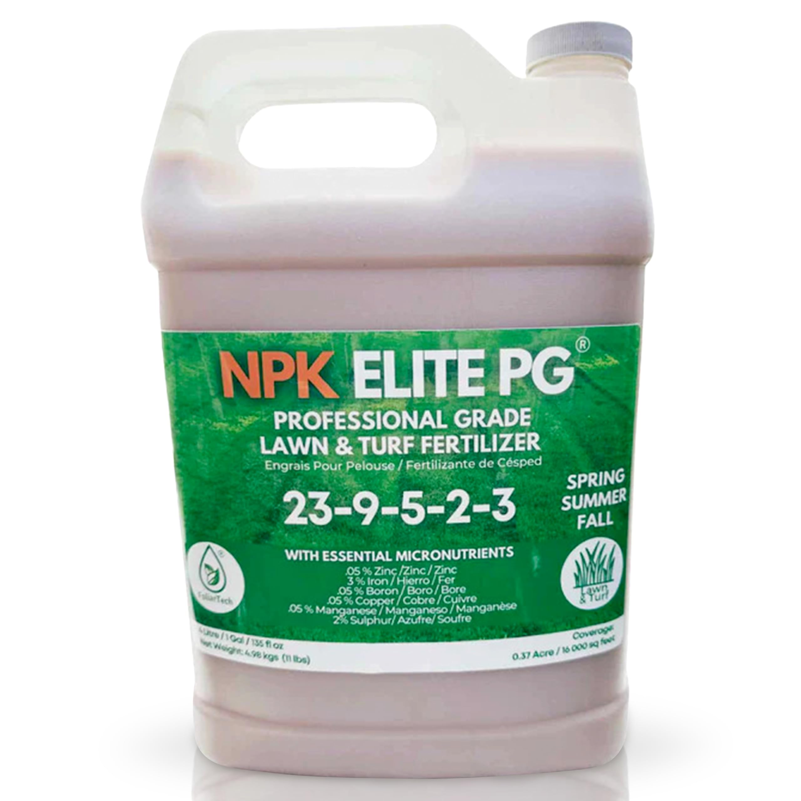 Boost Root Defense and Vibrancy: Fortify your turf with NPK Elite PG liquid fertilizer! This liquid fertilizer for lawns strengthens the rootzone against summer heat and heavy foot traffic, bridging the color gap between granular applications for a lush, standout lawn. Infuse Your Soil With Nutrients: NPK Elite PG grass fertilizer for lawn features an advanced blend of nitrogen, phosphorus, potassium, sulphur, and iron. These key nutrients enhance our lawn fertilizer to retain vibrancy for up to 3 weeks. Easy and Versatile Application: Apply our liquid lawn fertilizer concentrate every 2-4 weeks using a backpack, pump sprayer, or broadcasting sprayer evenly in a hashtag pattern. Remember to water the areas heavily 2-6 hours after applying our lawn fertilizer to prevent leaf burn. Nurture All Types of Grass: NPK Elite PG is your ideal Spring, Fall, and Summer fertilizer for lawns! From St Augustine grass to Bermuda, this versatile fertilizer for grass feeds various grass types with optimal nutrients. Gardening for a Better Tomorrow: Our liquid fertilizer, made in Canada, is specially formulated to cater to high-traffic lawns. It sets new quality standards, meeting the high expectations of dedicated lawn enthusiasts. Transform Your Lawn with FoliarTech’s Premium Liquid Fertilizer Whether you're a professional landscaper or a homeowner passionate about maintaining a vibrant, healthy lawn, our NPK Elite PG is the ultimate fertilizer liquid you need. Designed explicitly for high-traffic lawns, this advanced liquid solution is proudly made in Canada, setting new quality standards for those who expect exceptional results. Our liquid lawn fertilizer stands out from traditional fertilizers due to its robust combination of nutrients. The name NPK refers to the key elements in our fertilizer — Nitrogen, Phosphorus, and Potassium. The balanced ratio of these elements ensures your lawn's optimal development. It's the perfect fertilizer for green grass, providing all the essential nutrients to thrive throughout the summer. One of the standout features of the NPK Elite PG is its high phosphorus content. Phosphorus is crucial for root development and helps plants efficiently use other nutrients. This high phosphorus fertilizer ensures your lawn's roots grow strong and deep, creating a lush, resilient surface. The NPK Elite PG is a versatile lawn fertilizer perfect for Spring, Summer, and Fall. It comes in a concentrated form, making it an excellent choice. To use, simply dilute the lawn fertilizer concentrate with water, following the recommended ratios provided on the packaging. It's suitable for use with most fertilizer spreaders for lawns, ensuring quick and even distribution. Product Features Professional Grade for Home Use Mixes With Any Liquid Does Not Clog Sprayers Promotes Root Development Combats Stress, Drought, & Disease Maintains Vibrant Color Improves Soil Structure No more digging in disappointment — we mean results. At FoliarTech, our mission is to help you achieve the lush garden of your dreams with our proven fertilization solutions and expert gardening insights. Create colorful gardens today.