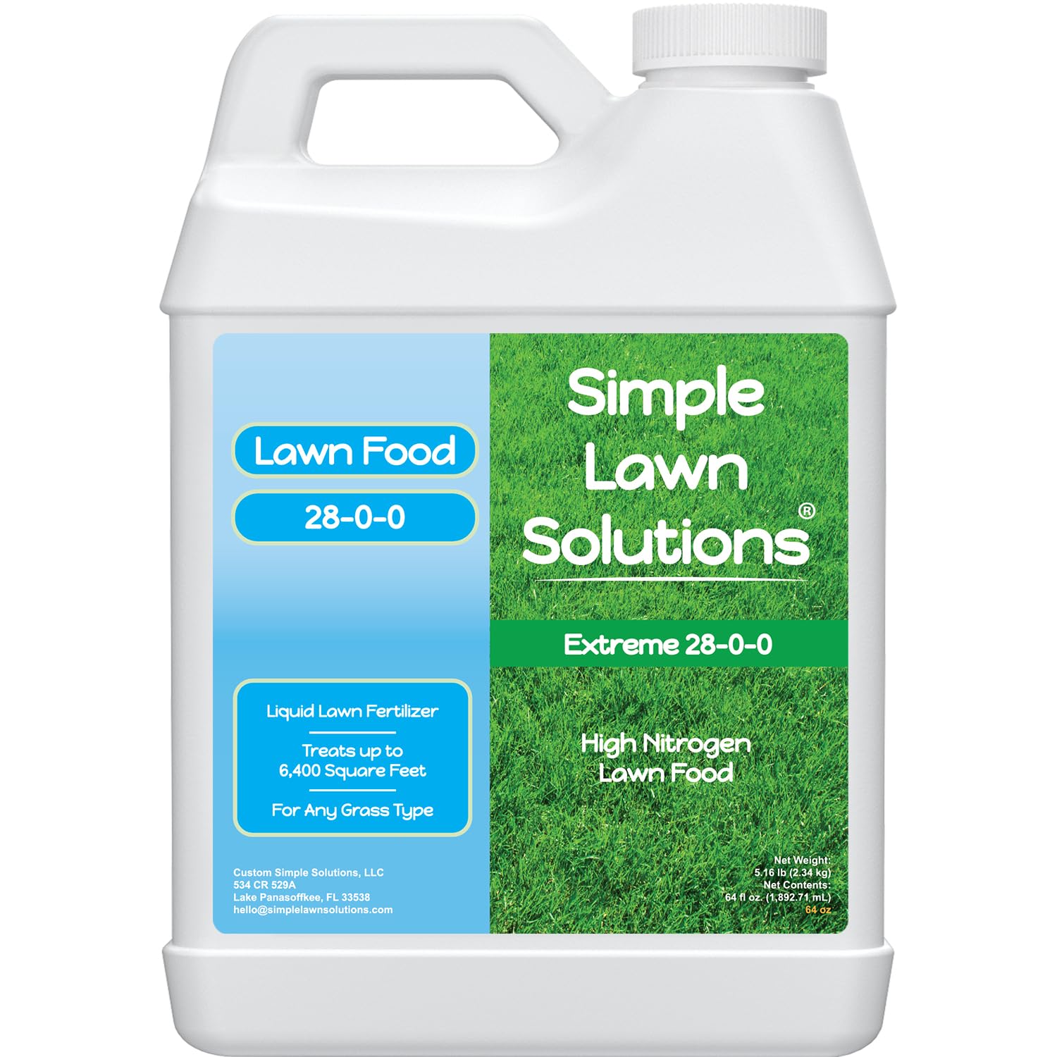 28-0-0 Liquid Lawn Food: High Nitrogen lawn fertilizer. Nitrogen helps in the formation of chlorophyll where plants get their green pigment. The addition of Nitrogen can encourage plant vigor for a thicker, greener, and more attractive lawn The Power of Quick Release & Slow Release Nitrogen Fertilizer: 70% quick-release nitrogen can provide quick nutrient absorption, addressing nitrogen deficiency quickly. 30% slow-release nitrogen keeps your lawn fed in-between applications 28-0-0 Lawn Food Fertilizer covers 6,400 square feet when using a hose-end sprayer: Refill 28-0-0 hose-end sprayer or use with a third-party Sprayer. Use on actively growing turf alongside your fertilizer program Produced In The United States: 28-0-0 is manufactured in the United States of America, by a family-owned business with 30 years of former experience in the commercial professional turf industry Can Be Used on All Warm Season and Cool Season Grass types: Including Bermuda, St. Augustine, Zoysia, Bahia, Fescue, Ryegrass & Kentucky Bluegrass Simple Lawn Solutions: 28-0-0 contains 70% quick-release nitrogen to quickly correct nutrient deficiencies and 30% slow-release nitrogen to continue supplying nutrients between applications. Use this liquid lawn food fertilizer to supply nutrients for top growth and greening. Nitrogen is the most frequently used macronutrient and is essential. Keep your lawn watered sufficiently to ensure nutrients are absorbed properly. The Features and Benefits: Premium 28-0-0 Liquid Lawn Food Fertilizer can promote growth and greening. Our High Nitrogen Formula contains 70% quick-release Nitrogen and 30% Slow-release Nitrogen. 28-0-0 can be used on every grass type, covers 6,400 square feet when applied with hose end sprayer, made & manufactured in the USA, and is used commercially. Use with a regular fertilizer program. Only apply to actively growing turf. Produced In The USA: 28-0-0 is manufactured in the United States of America, by a family-owned business with over 30 years of former experience in the commercial professional Turf and Agriculture Industry.