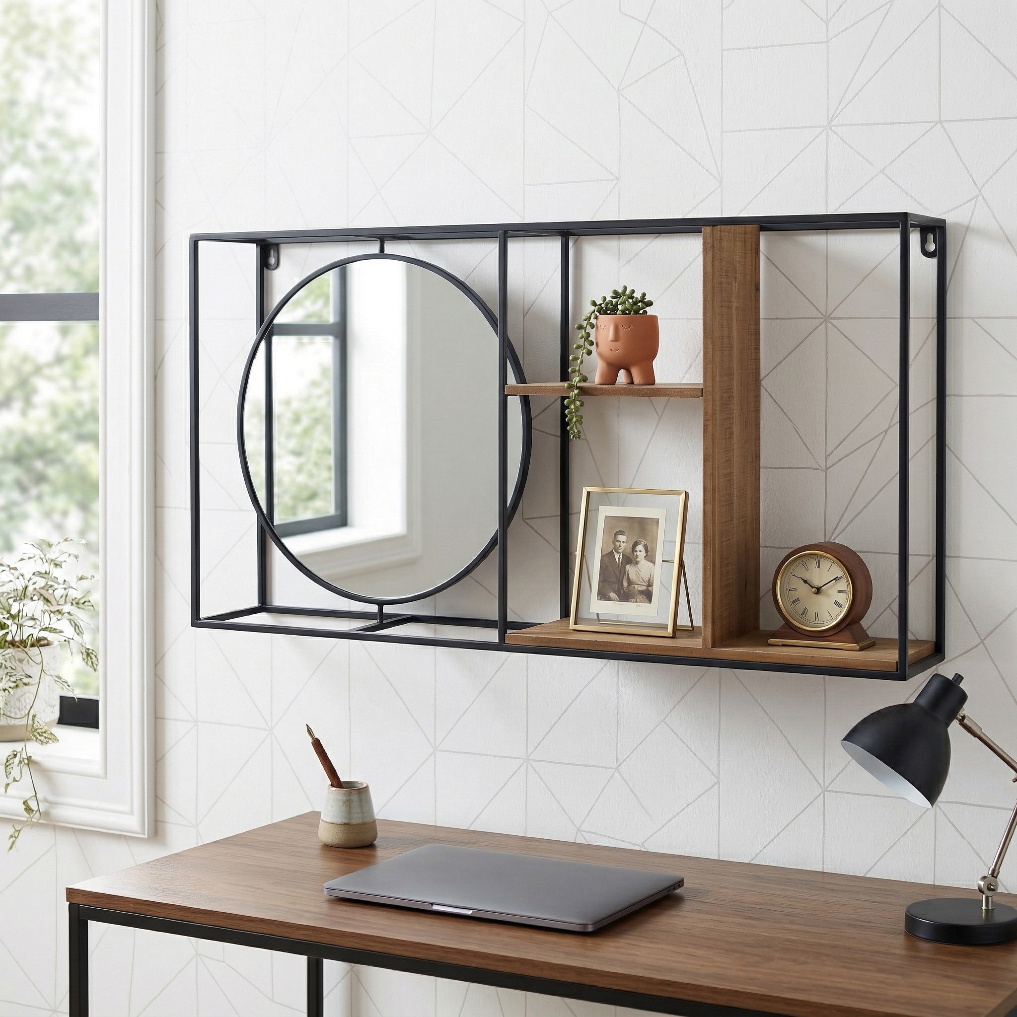 Designed to combine reflective style with practical organization, this decorative wall storage shelf pairs warm wood shelving with a sleek metal frame and integrated mirror to create a refined functional accent piece.