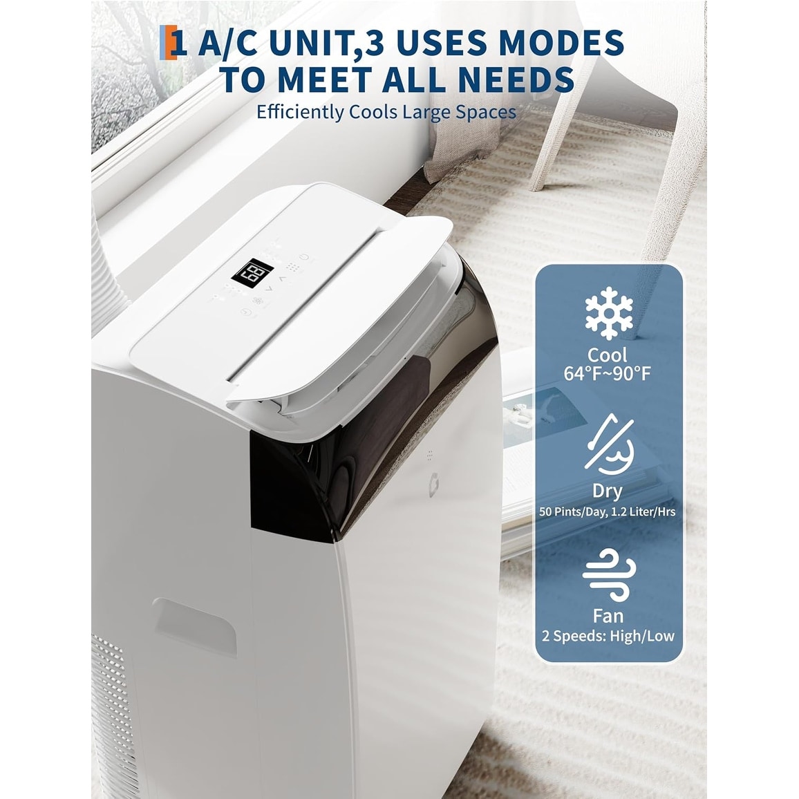 3-in-1 Functionality: With 14,000 BTU rapid cooling, this unit offers 3 major functions—AC, dehumidification, and fan.