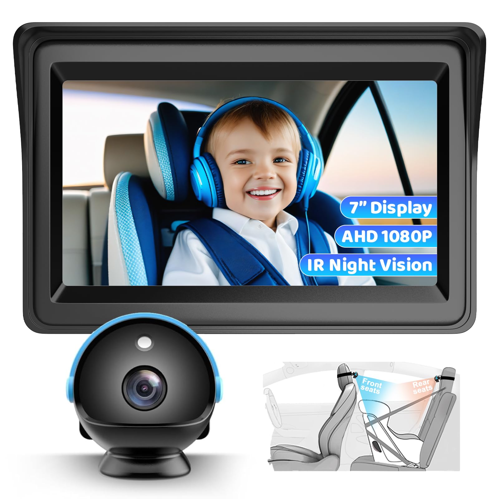 7" 1080P HD Display: The 7 inches large screen combined with 1080P resolution HD image display makes easier to observe babies and everything about them at a glance. 360° Rotating & 150° Wide View: Baby car camera for backseat can flexibly adjust direction 360 degrees. And 150° wide view allows yo