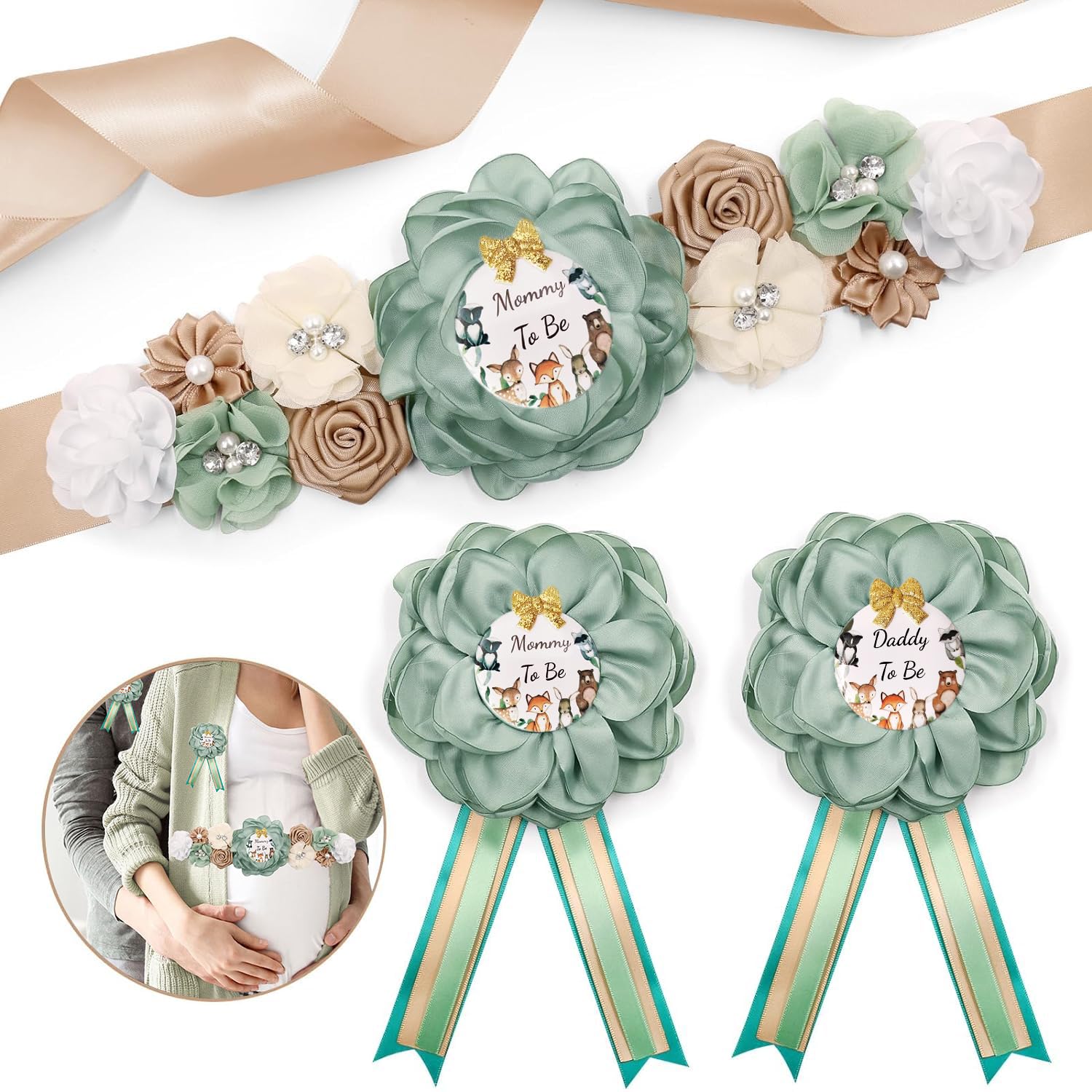 Precious Baby Shower Kit - Includes 1pcs Mommy to baby sash, 1pcs Mom to be corsage and 1pcs Dad to be corsage. Perfect for both baby boy or girl shower theme party. Create cute pictures for photo shooting or baby albums. Value Gift - The Maternity Sash corsages are handmade with resinous bear and s