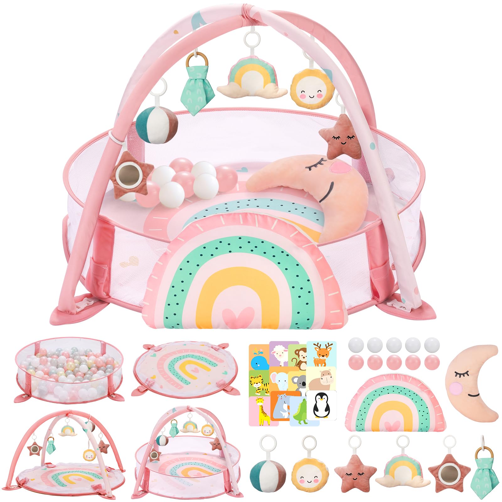 Foryoomi 7-in-1 XL Large Baby Play Gym Mat, Tummy Time Mat, Baby Gym & Ball Pit, Baby Activity Mat with Milestone Cards & 6 Detachable Toys for
