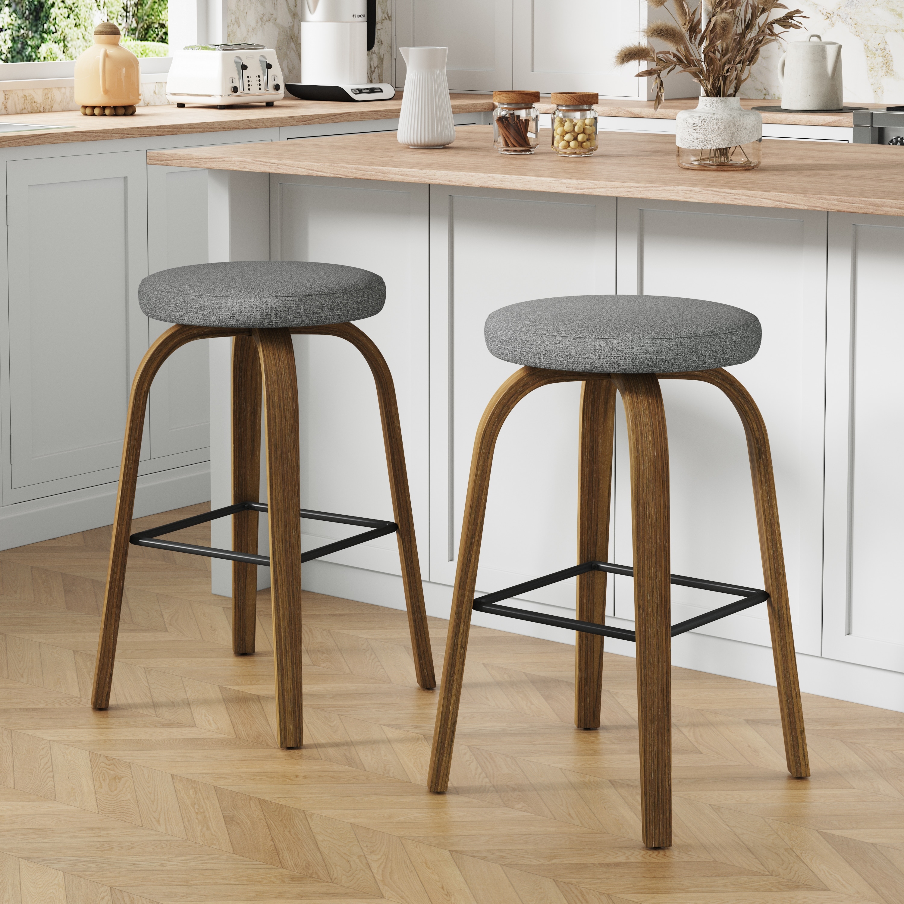 Modern Design: Our mid-century modern backless bar stools feature a padded fabric seat, solid wood legs, and a durable metal footrest, embodying contemporary style suitable for any decor.