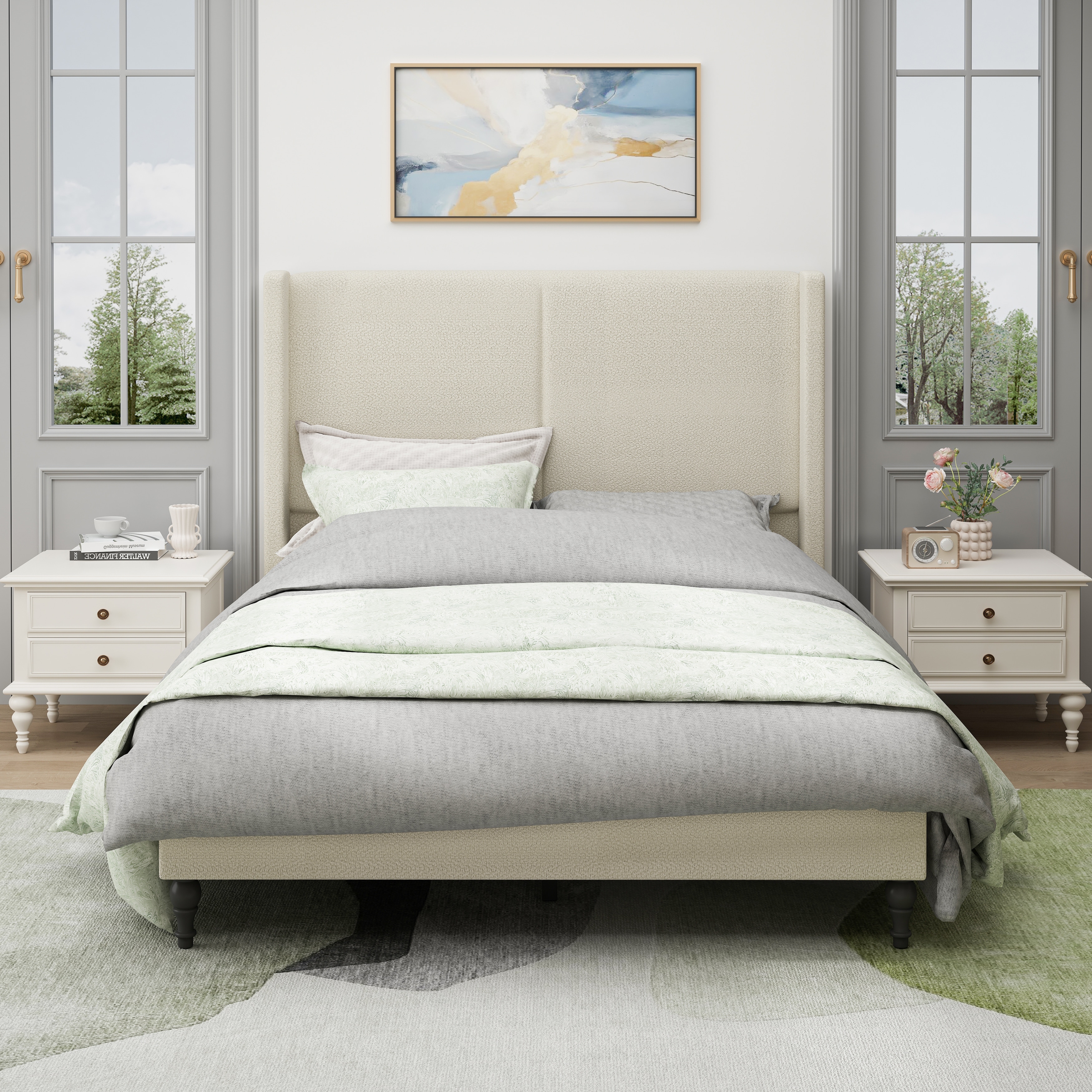 Description: This king-size high-back upholstered bed combines elegance and comfort, featuring a luxurious tufted headboard wrapped in soft boucle fabric.