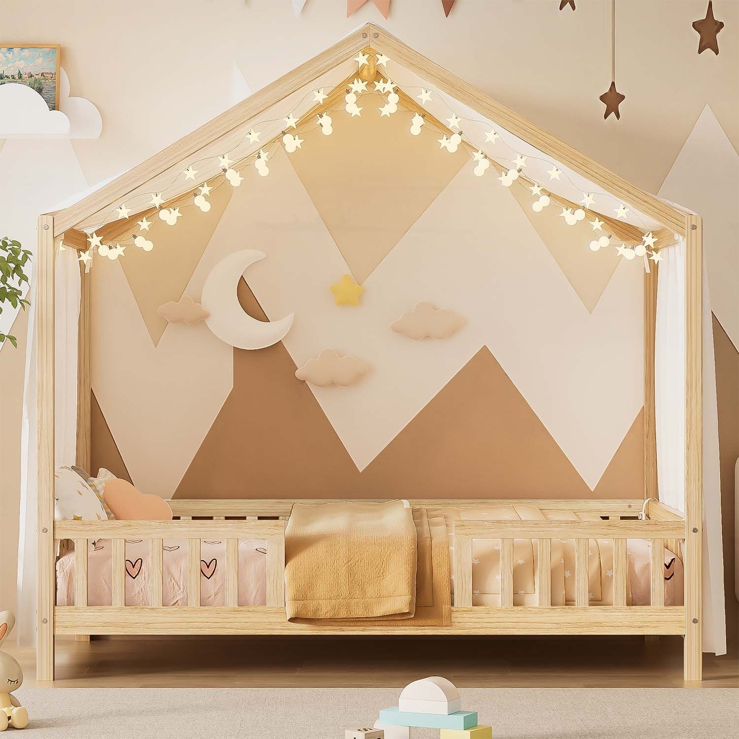 Transform your child's bedroom into a magical and cozy retreat with this Montessori floor bed. The -size bed frame comes with a top canopy, allowing you to create a dreamy and romantic atmosphere.