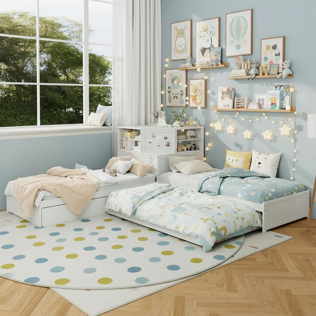 Transform your kids' bedroom or guest space into a multifunctional retreat with this innovative L-shaped twin bed platform, which integrates two twin beds, a pull-out trundle, and a clever corner platform into one smart design.