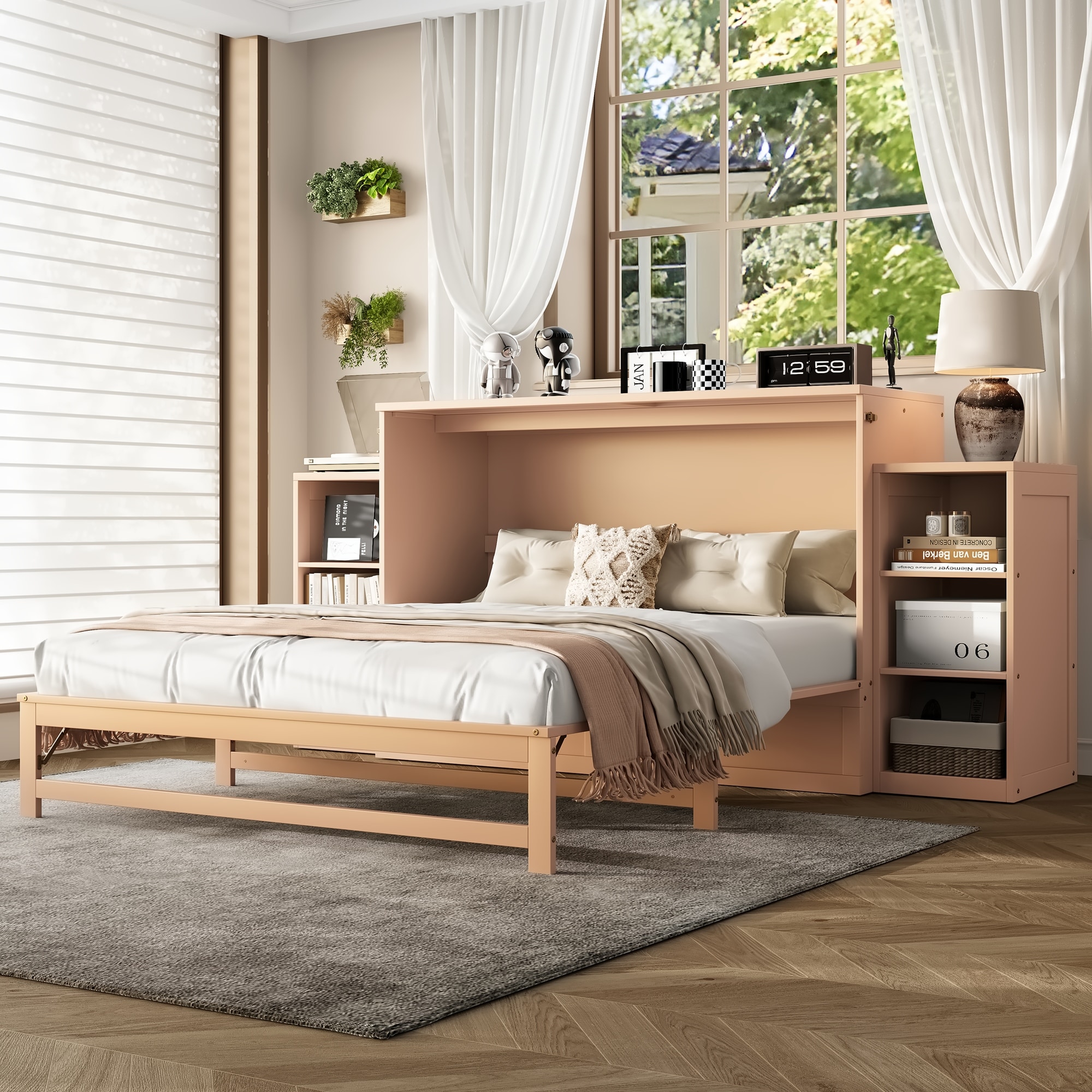 Full Size Murphy Bed Wall Bed with Storage Shelves, Wooden Foldable Wall Platform Bed Frame, Living Room Hidden Cabinet Beds
