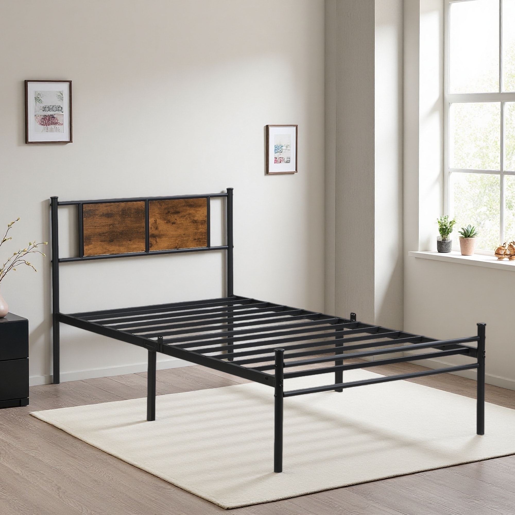 This Twin XL Size Metal Bed Frame combines a sleek metal structure with a stylish wood panel headboard for a modern and durable sleep solution.