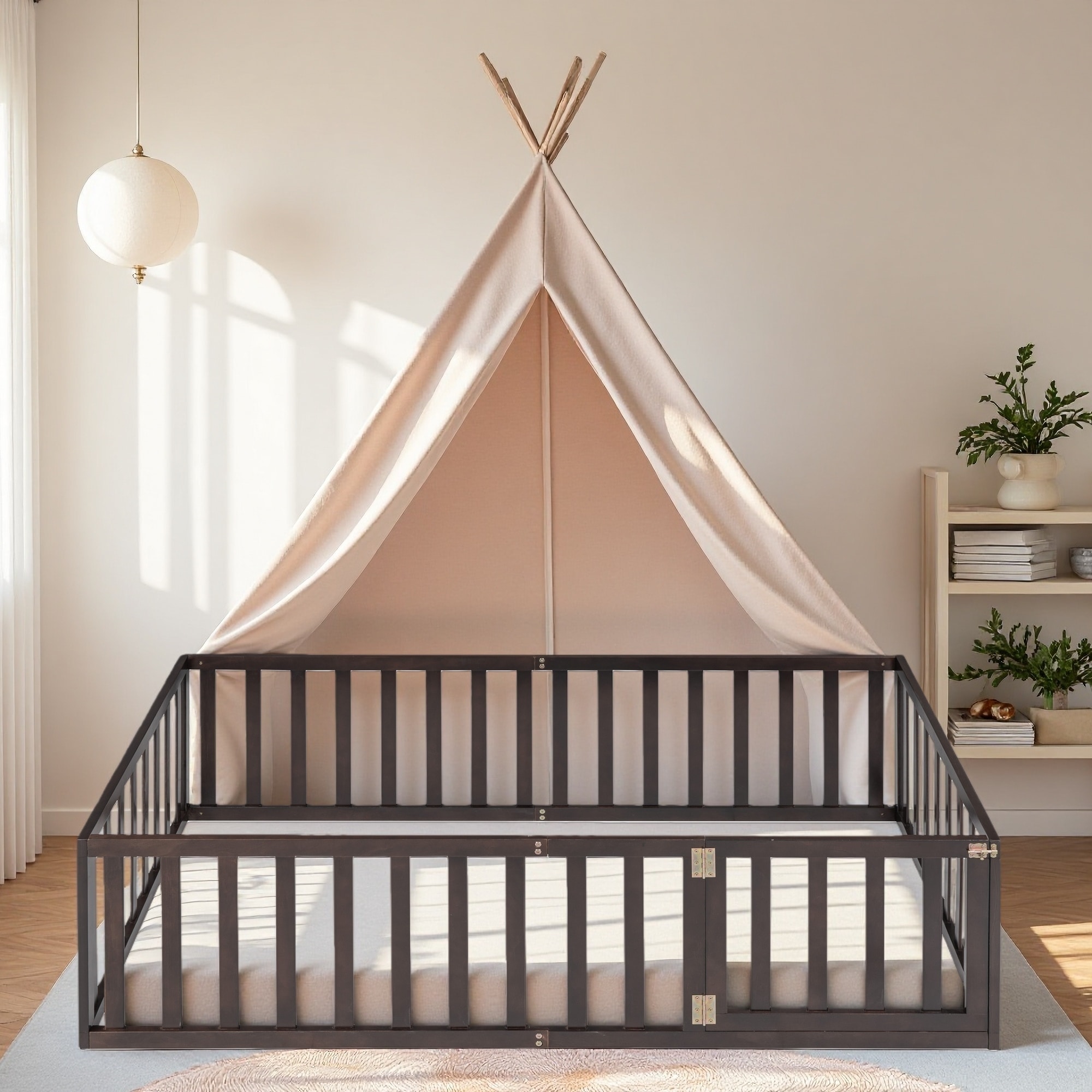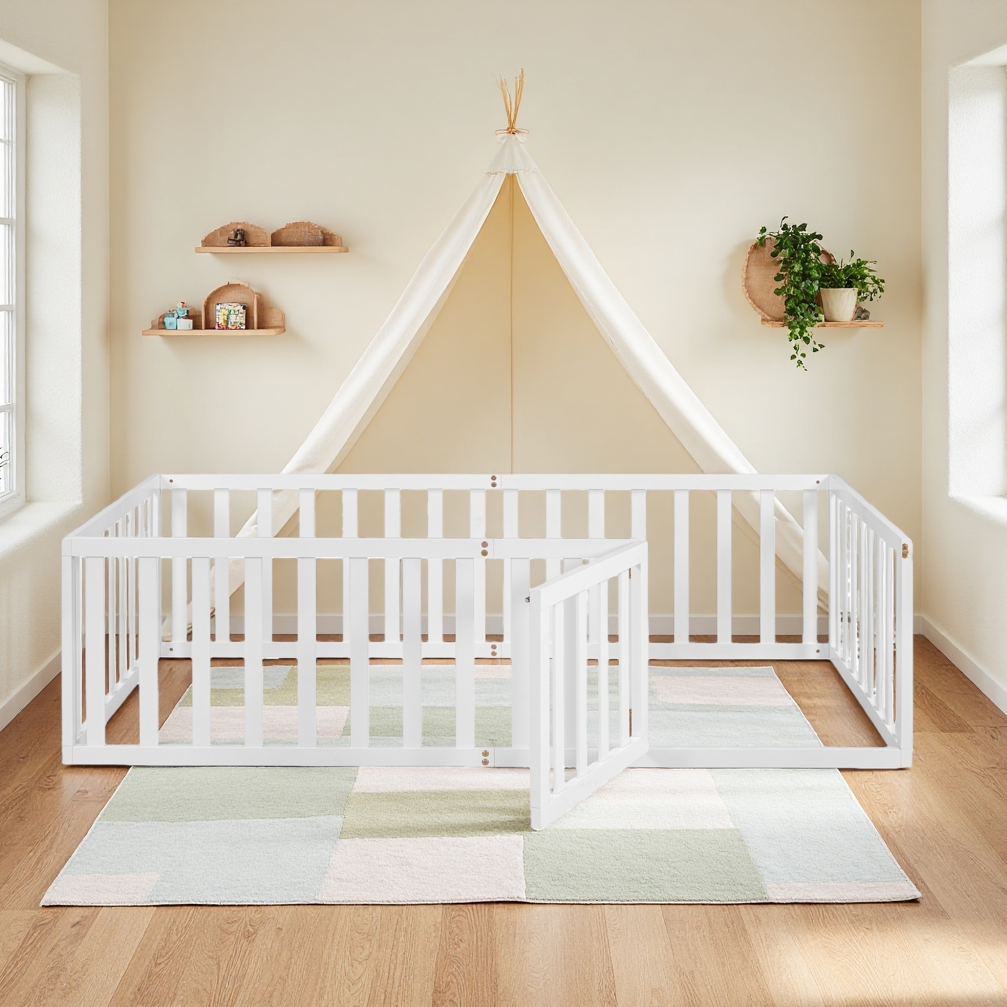 Twin Wood Floor Bed with Fence & Door, Pinewood, Open-Row, Playful Design