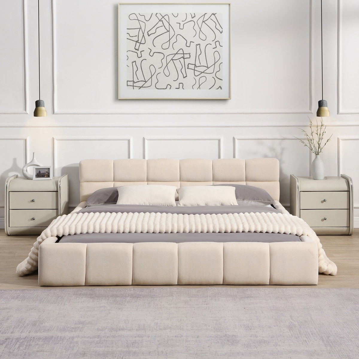 Elegant Beige Chenille Upholstered Bed with Checkerboard Design