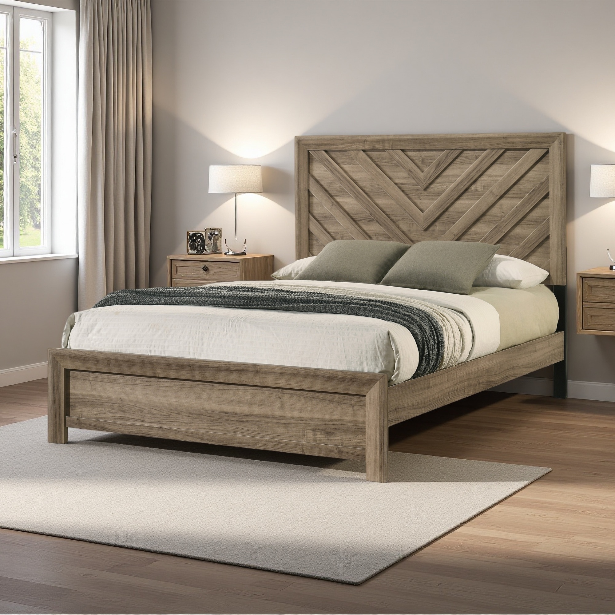 Add a touch of contemporary rustic charm to your bedroom with this twin size panel bed, featuring a bold chevron-patterned headboard for visual texture and style.