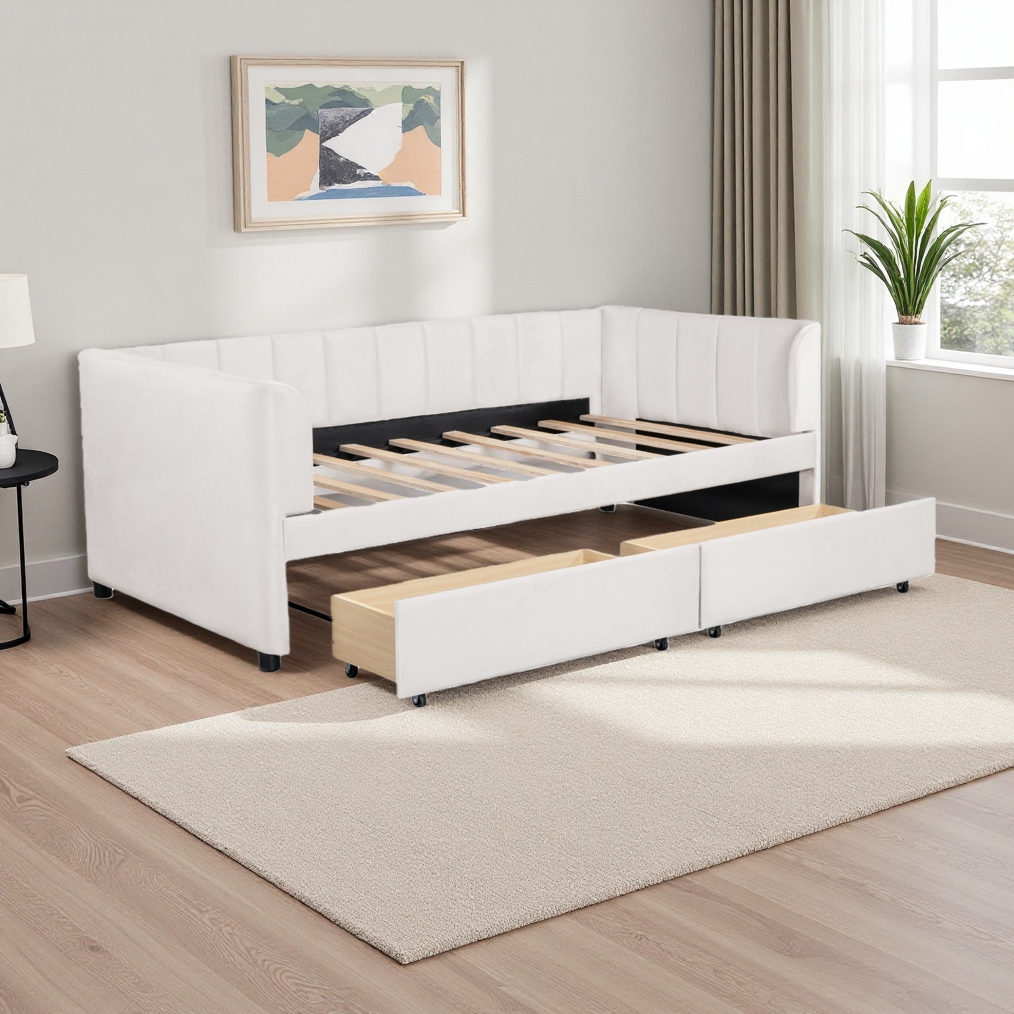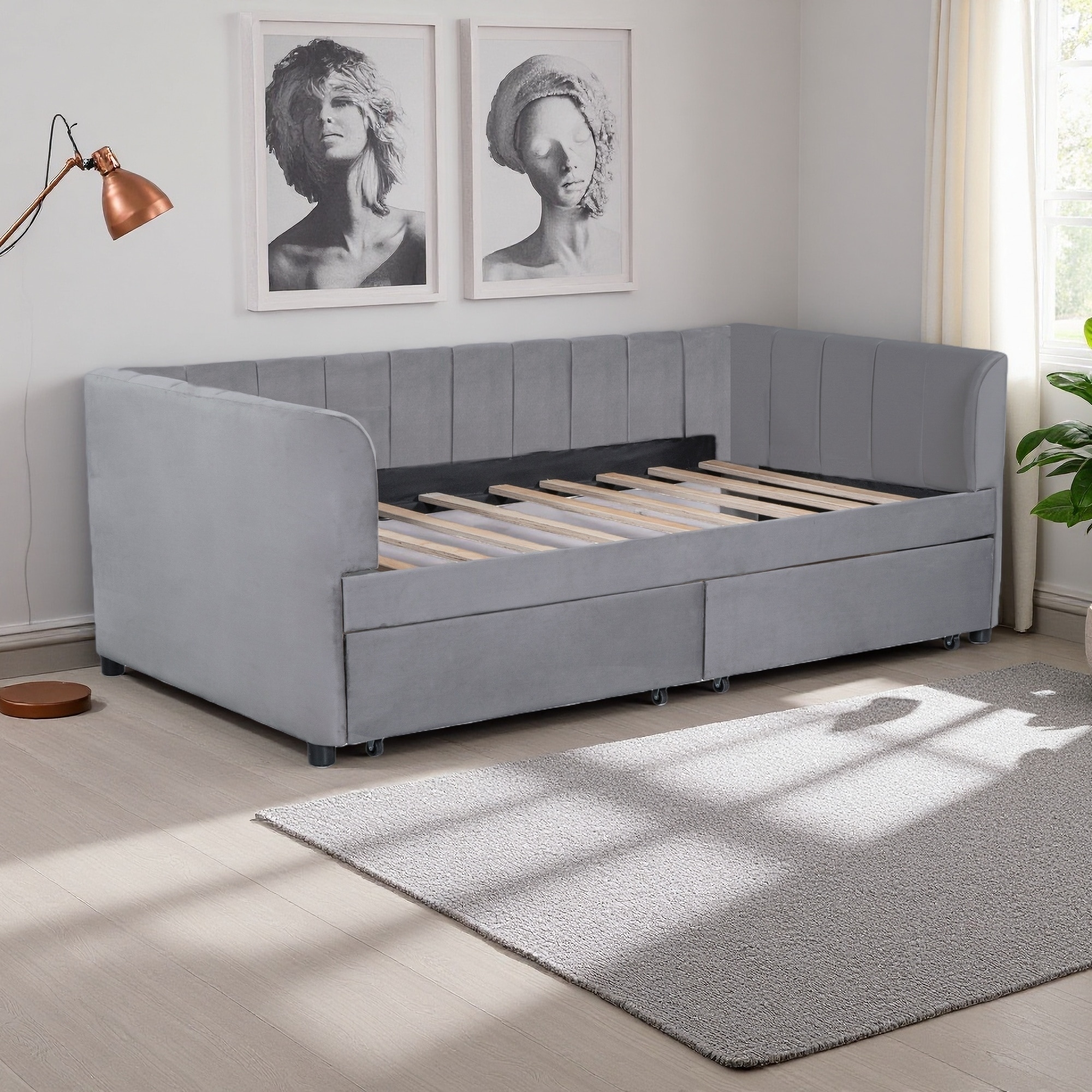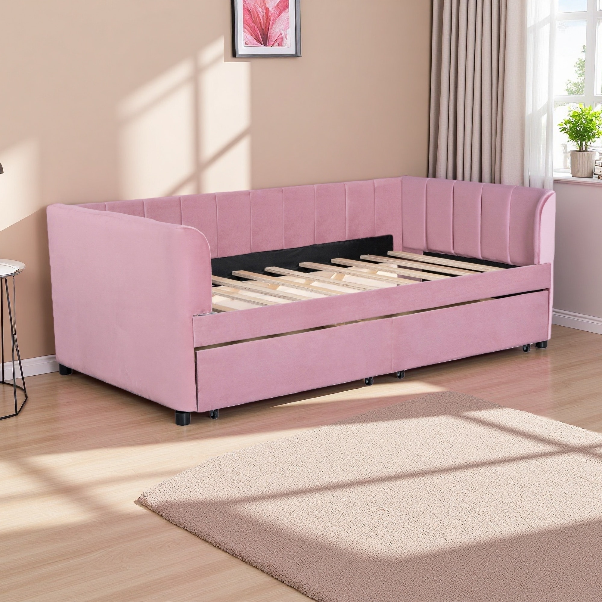 Product Details: Overall Dimension: 79.7" (L) x 41.9" (W) x 28.9" (H) Material: Velvet Upholstery Weight Capacity: Bed: 250 lbs, Trundle: 250 lbs Recommended Mattress Thickness: 6" (Mattress not included) Number of Slats: Bed: 10 slats, Trundle: 8 slats…