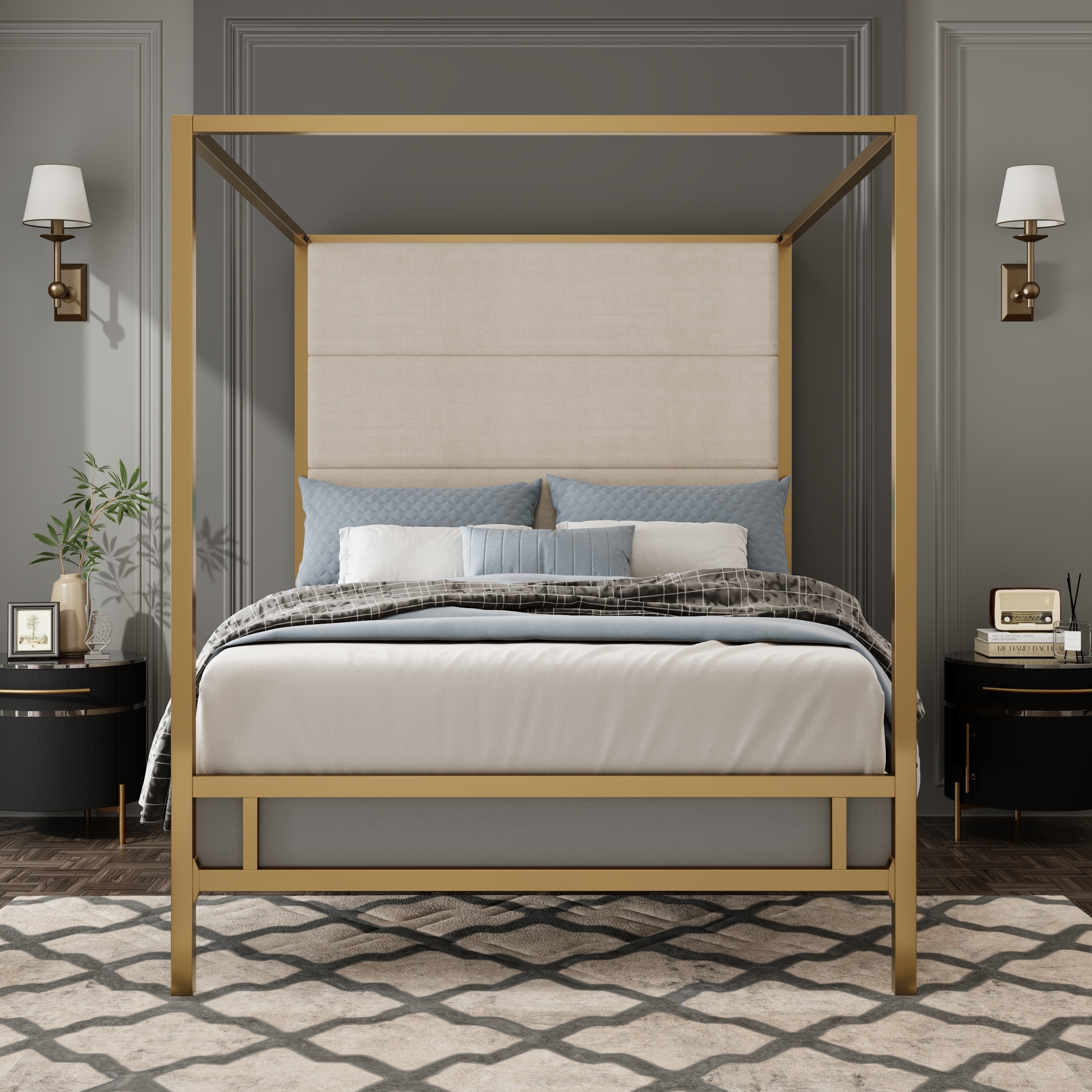 Metal 4-Poster Bed Frame Modern Canopy Upholstered Bed with Tall Upholstered Headboard