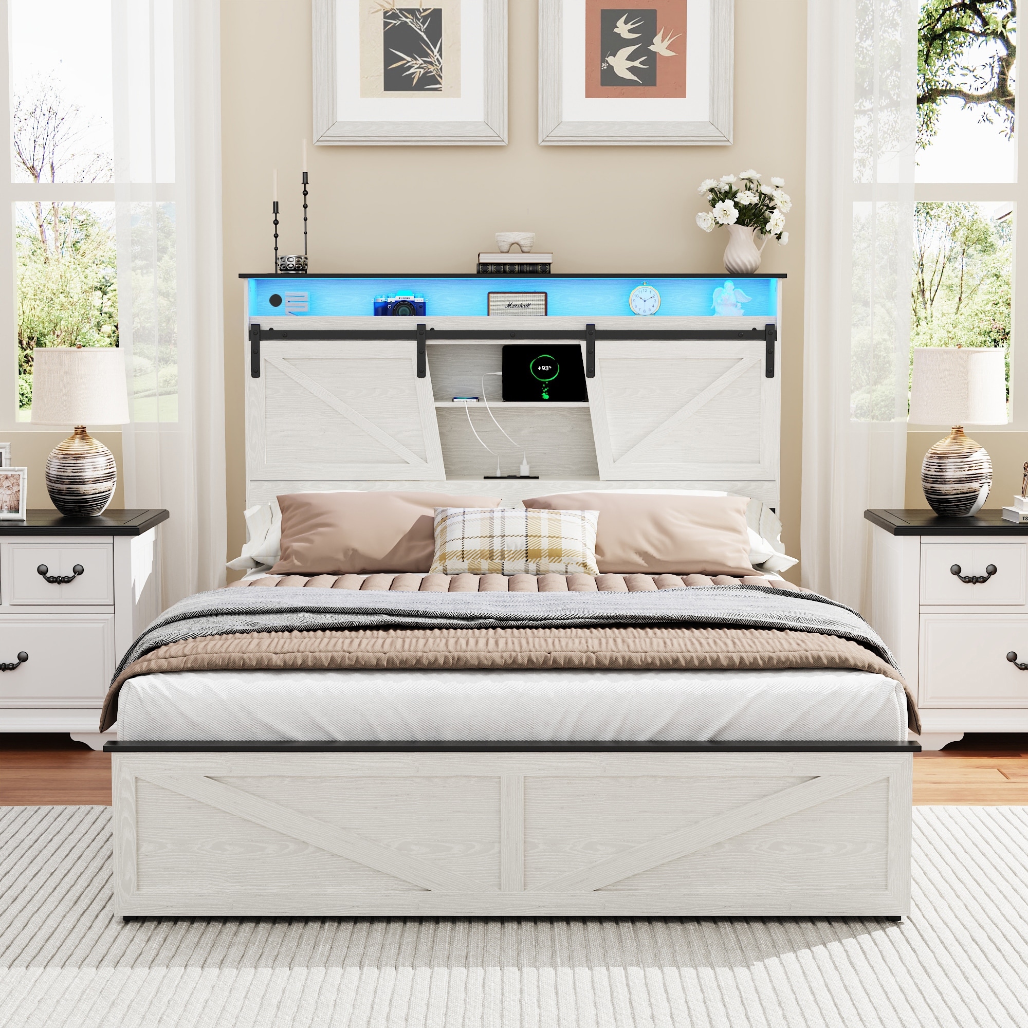 White Platform Bed Frame with 2 Drawers and Bookcase Headboard/LED Lights/Sliding Barn Door Storage Shelves and Charging Station