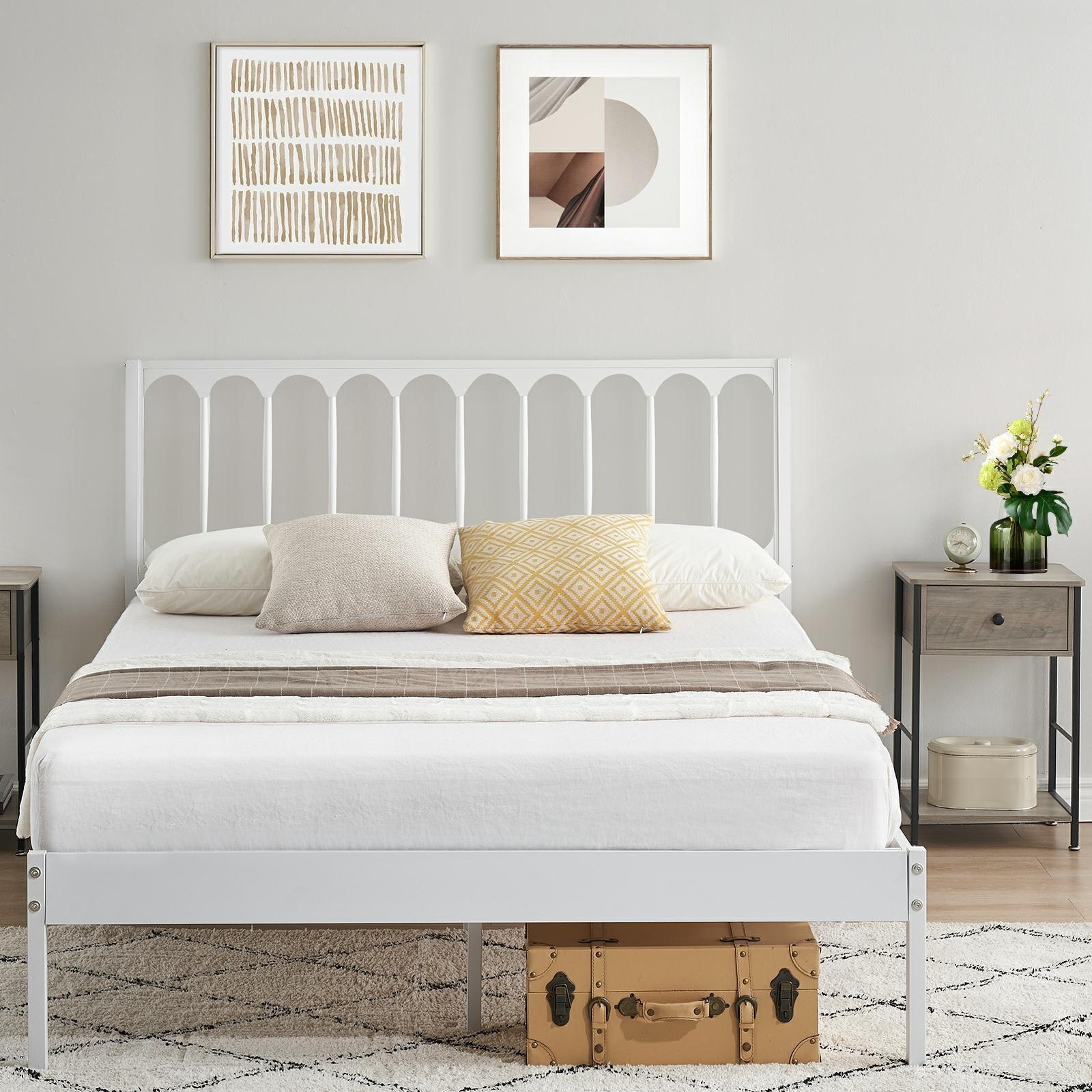 Enhance your bedroom with a chic queen-size metal platform bed frame featuring a refined wave-patterned headboard for elegance and resilience, providing robust support without the need for a box spring.