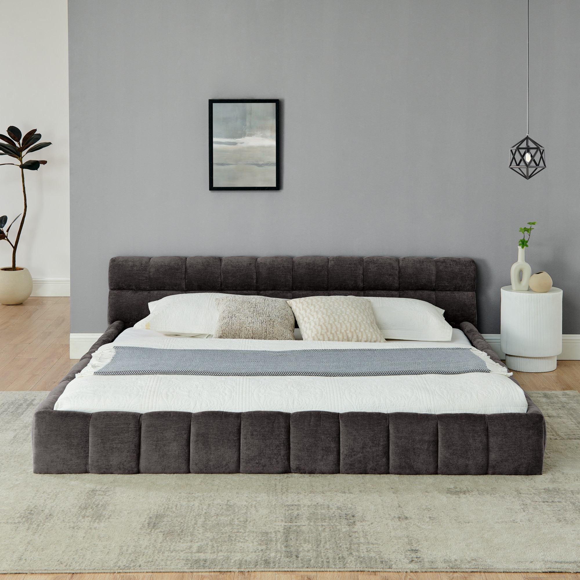 King size Grounded Bed Frame with Low-profile Design, Chenille Fabric Platform Bed with Padded Headboard, No Box Spring Needed