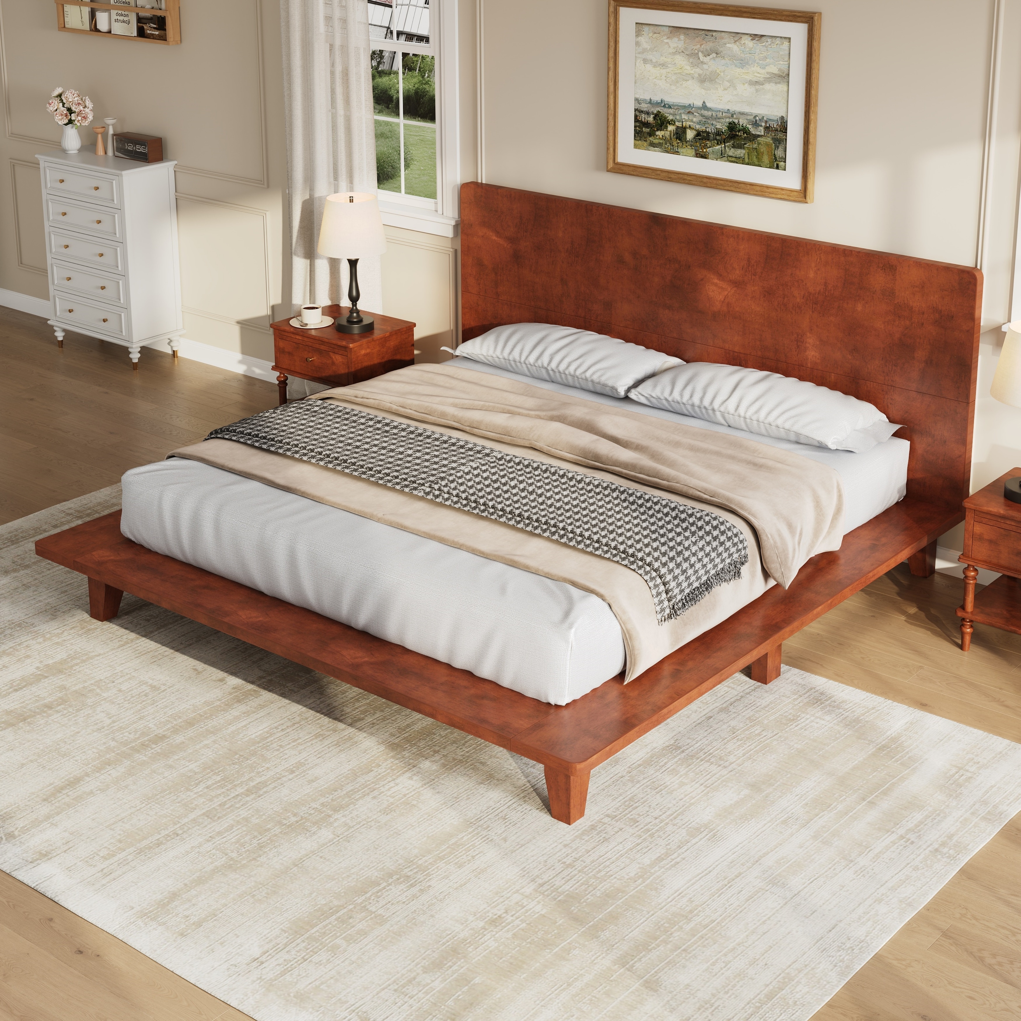 Transform your bedroom with the timeless charm of this rustic wood platform bed. Constructed from high-quality pine wood and MDF, this bed offers reliable support for your mattress, eliminating the need for a box spring.