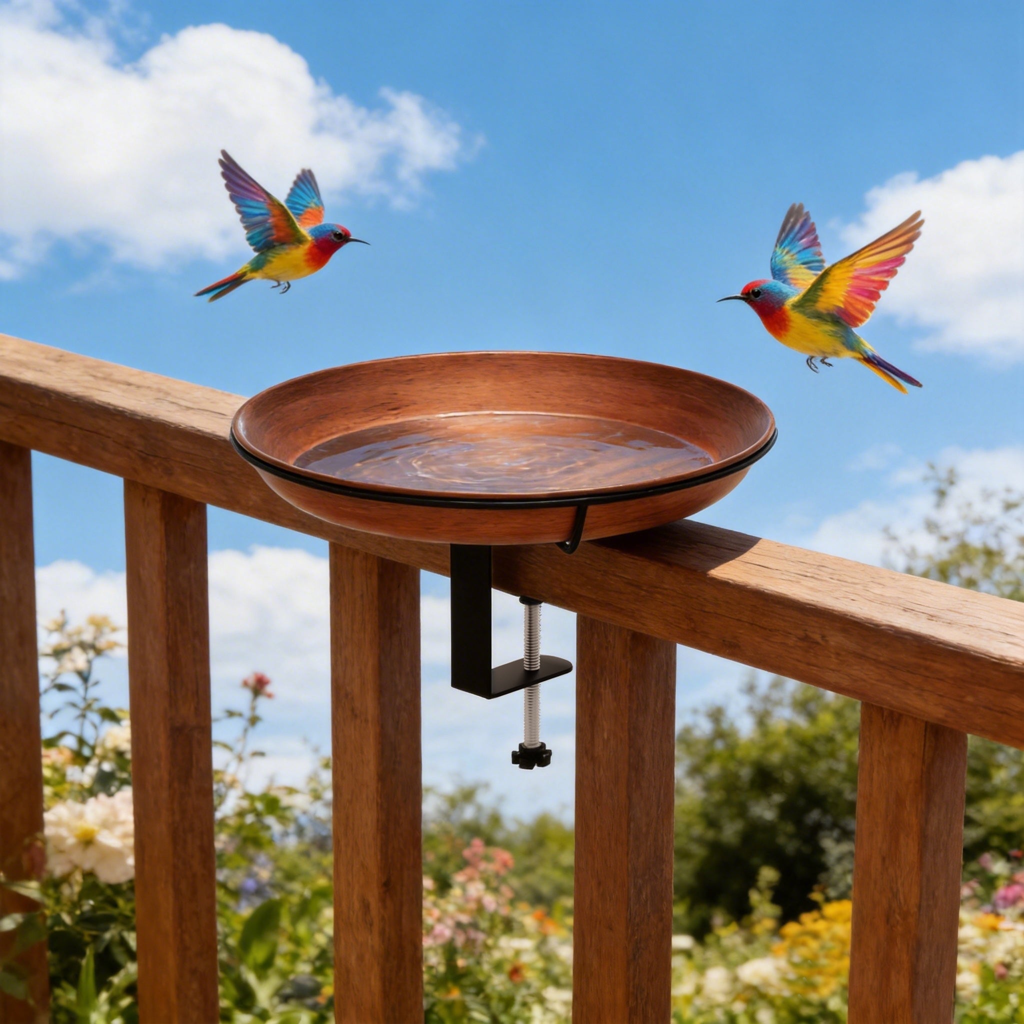 Javlergo Antique Copper Bird Bath for Outdoor Deck Mounted Metal Birdbath Bowl with Adjustable Clamp Bird Feeder for Balcony