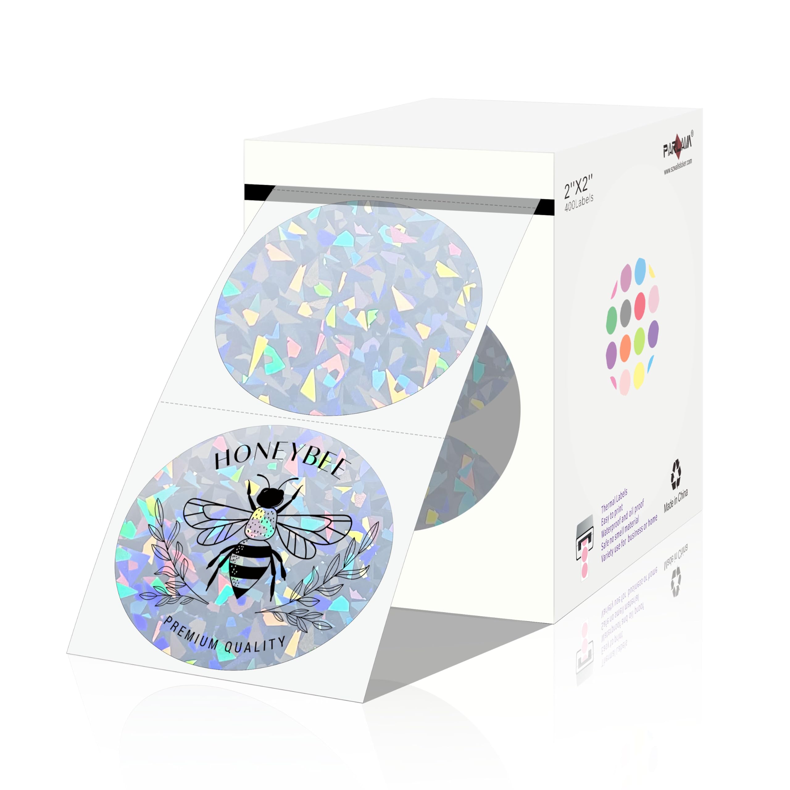 2 inch Holographic Sliver Dot Direct Thermal Printing Labels is Holographic Paper material-400Pcs per Roll, 1.1 inch core, Self-adhesive, the Holographic Sliver material is radiant, can reflect variety colors under the light just like the Diamond on paper , and will make your logo more deluxe and at