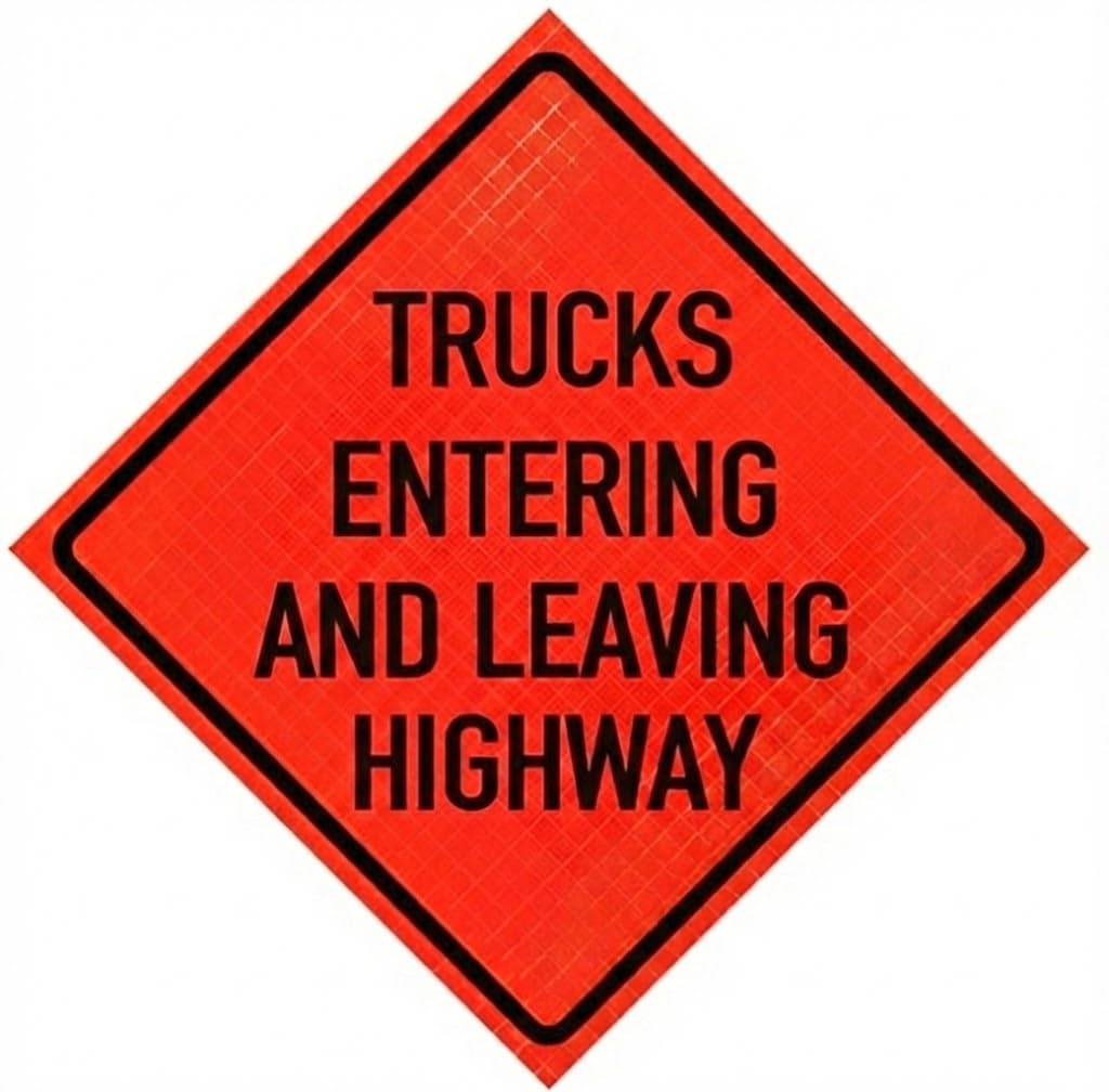 36 inch REFLECTIVE SUPER BRIGHT FLOURESCENT ORANGE ROLL-UP WARNING SIGN. LEGEND: TRUCKS ENTERING AND LEAVING HIGHWAY