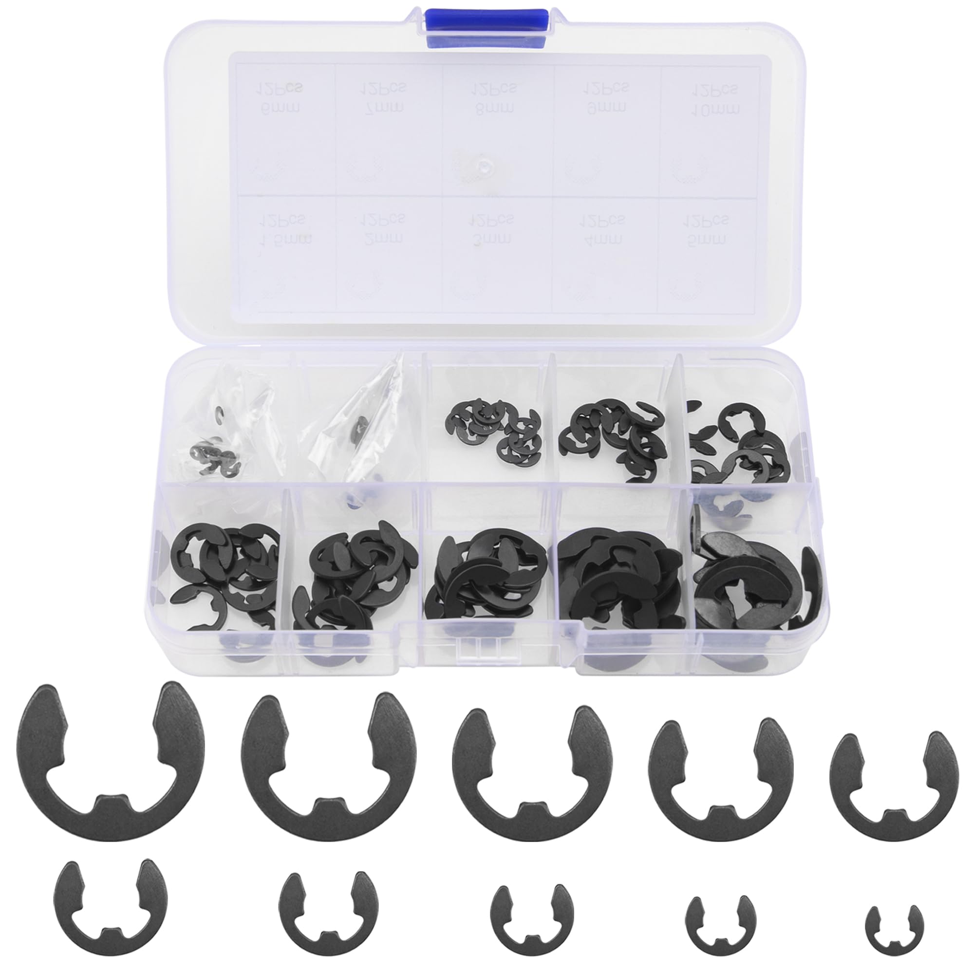 Package include 10 sizes 120pcs of E-Clip Circlip Assortmen,each size has 12Pcs. The Snap Ring E clips Circlip are widely applied for axles, shafts, bearings,u Joint gears.it compatible with cylinders RC cars Lawnmowers ,doors and bearings, valves, rc boat u joint etc. Wide Size Range (Metric): 1.5