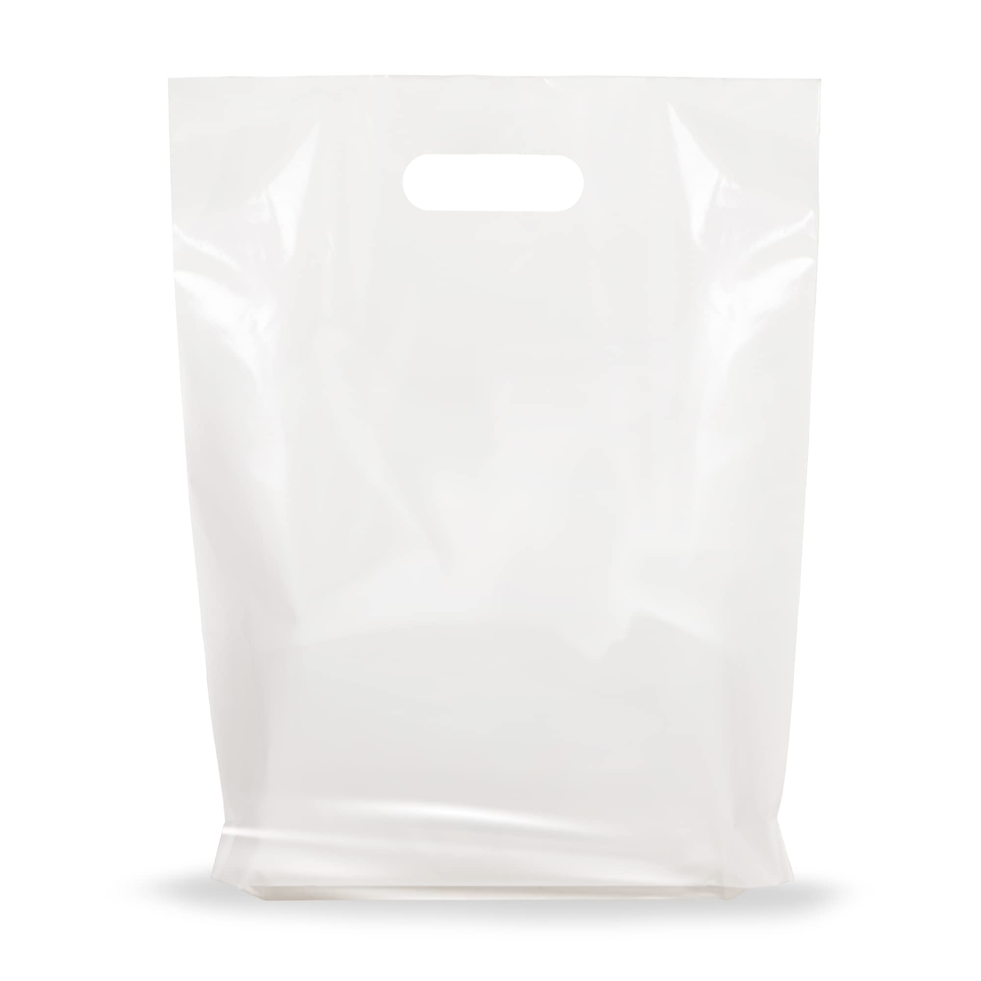 PPB POPULAR PLASTIC BAGS - 100 White Glossy Plastic Shopping Bags - 12x15x1.25 in - Die Cut Handles - Reusable & Recyclable - Ideal for Retail Stores