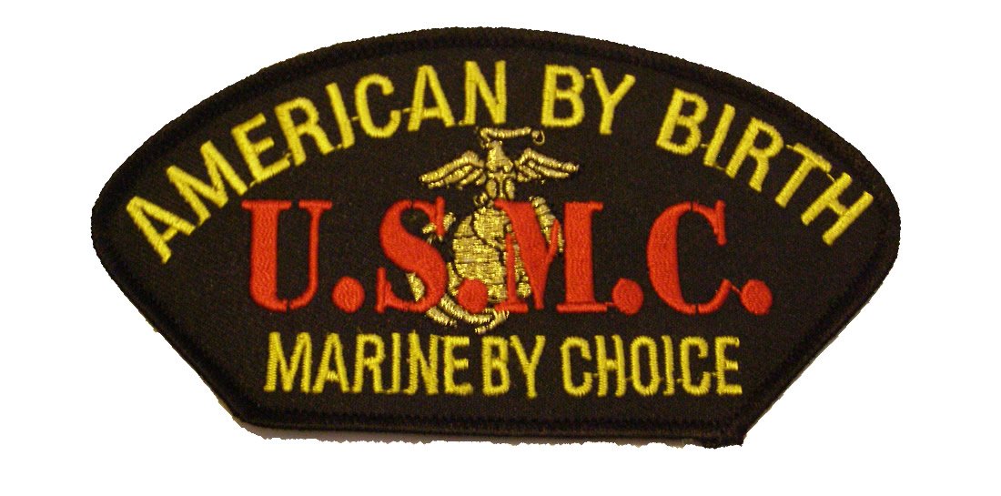 AMERICAN BY BIRTH MARINE BY CHOICE U S M C with EAGLE GLOBE and ANCHOR PATCH - Yellow Red and Gold on Black Background - Veteran Owned Business 5 1/4" wide x 2 3/4" tall PATCH. High Quality Embroidered AMERICAN BY BIRTH MARINE BY CHOICE U S M C with EAGLE GLOBE and ANCHOR - Yellow Red and Gold on Bl