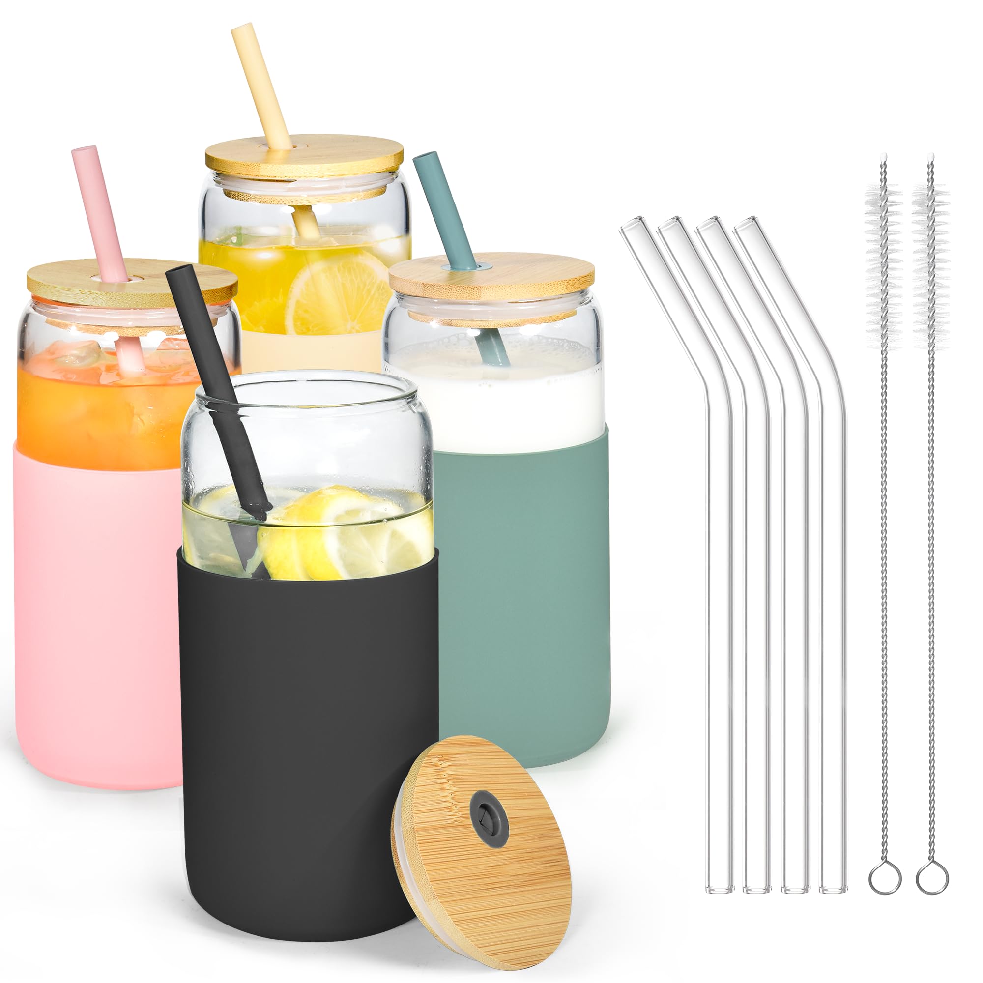 Icesip 20oz Glass Coffee Cups with Lids and Straw Iced Coffee Glasses with Silicone Protective Sleeve Drinking Glasses Set of 4 for Juice Beer