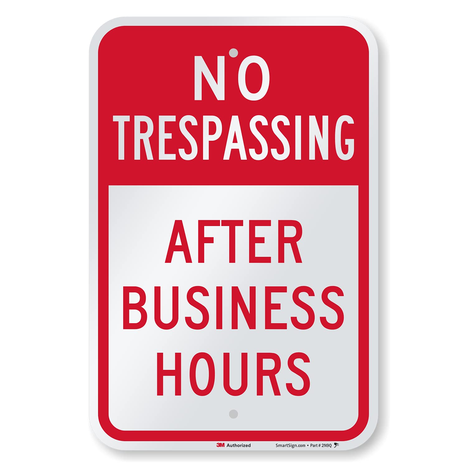 DURABLE ALUMINUM: 'No Trespassing After Business Hours' signs are made of 63 mil thick heavy-duty rustproof reflective and laminated aluminum that easily lasts 10 years outside and meets DOT road and traffic requirements. EASY INSTALLATION: All signs come with rounded, burr-free corners and 3/8 inch