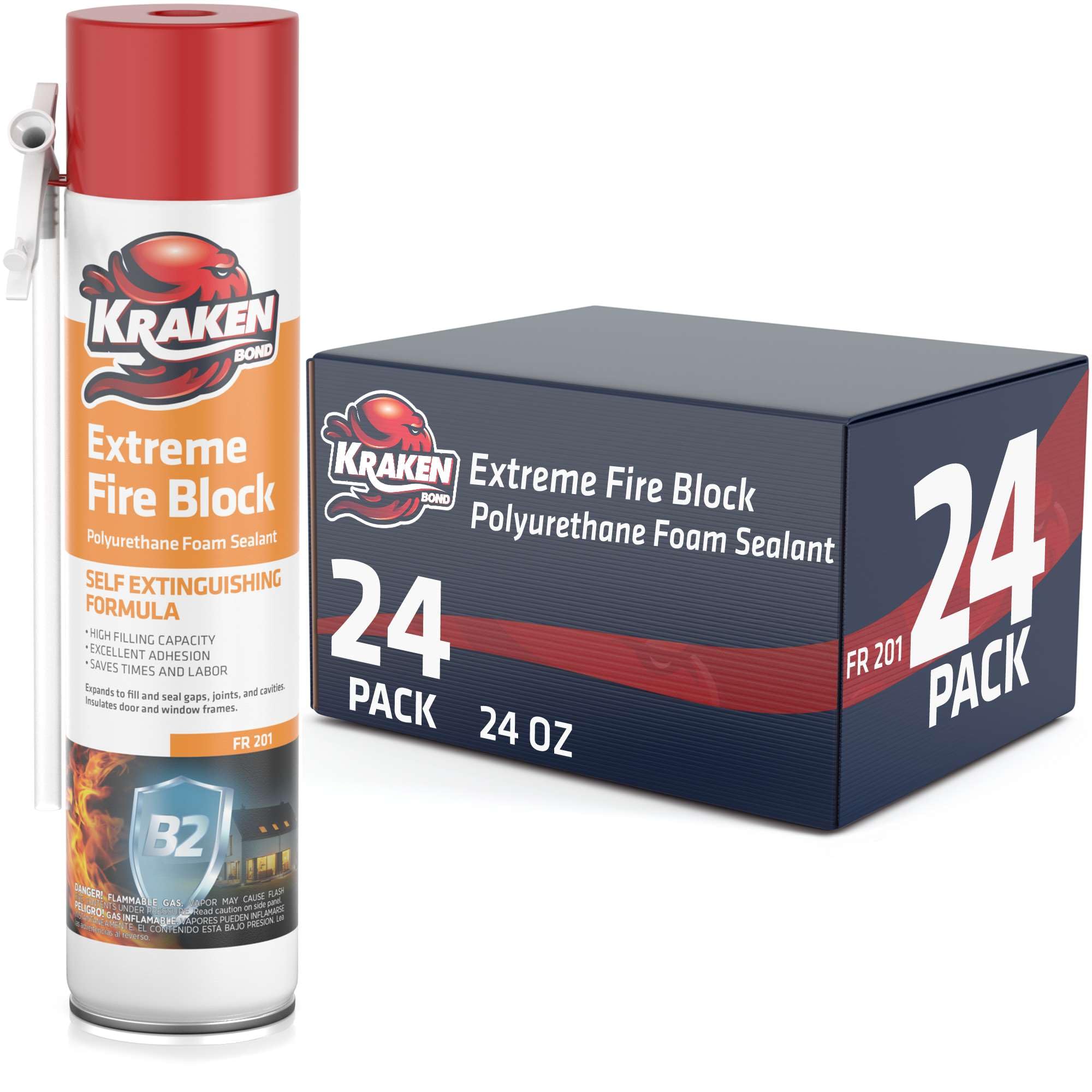 Kraken Bond Extreme Orange Fire Block Foam - (24x24oz) Fire Rated Polyurethane Spray for Gap Filling, Sealing on Windows, Walls, Joints & Pipes, Straw