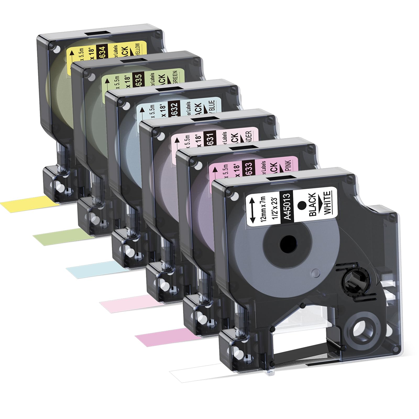 Package includes: 6-Pack Compatible with Dymo D1 label tape. Width for each tape: 1/2 Inch (12mm). Colors in one set: Black on white (Compatible with DYMO A45013), Black on Lavender (A14631), Black on Milky Blue (A14632), Black on Baby Pink (A14633), Black on Lemon Yellow (A14634), Black on Mint Gre