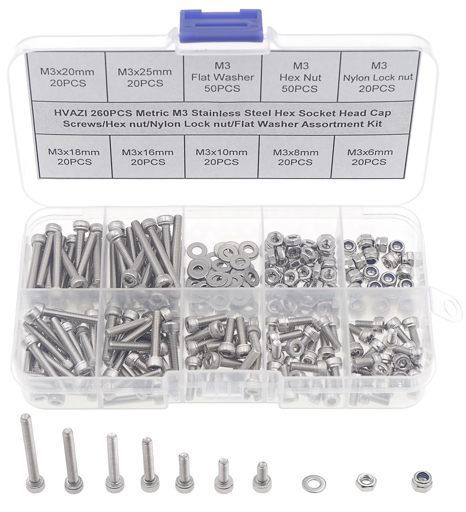 260pcs Metric Stainless Steel M3 Socket Head Cap Screws/Hex Nuts/Nylon-lnsert locknuts/Flat Washer Assortment Kit Thread Diameter:M3;Thread Pitch:0.5mm(Coarse);Full Thread length;Thread Direction:Right Hand;Hexagonal size inside:2.52-2.58mm M3 Socket Head Cap Screws different length:6MM,8MM,10MM,16M