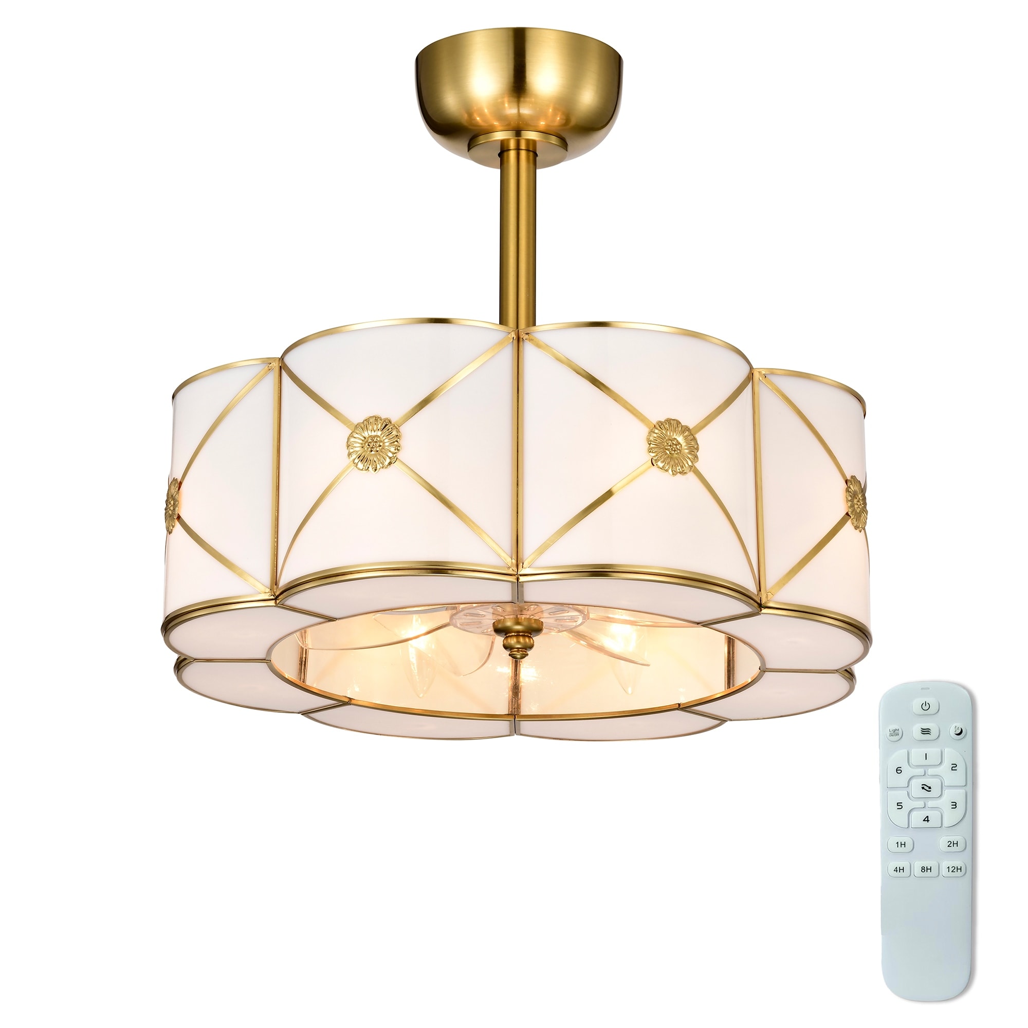 Lighted Ceiling Fan 6-Light Fandelier Brass Trim Opaque Glass Ribbon Weave Shade Remote Control