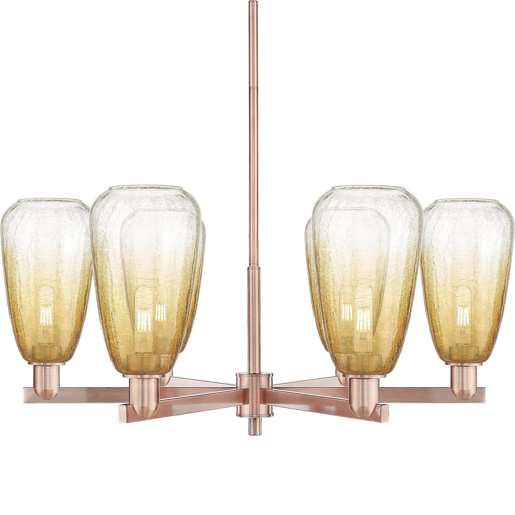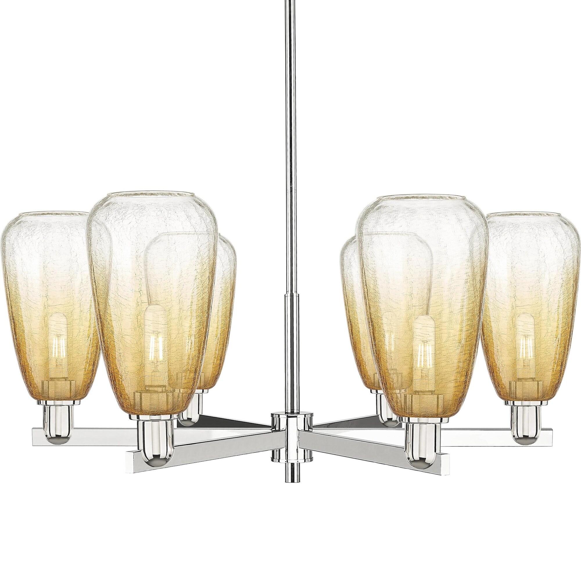 Features: Cast brass, glass, and steel construction Amber, blue, clear, grey, white colored, crackle glass teardrop shades Sloped ceiling compatible Fixture includes 6" and 12" downrod(s) (6) medium (E26) 100 watt bulbs required (not included) Capable of…