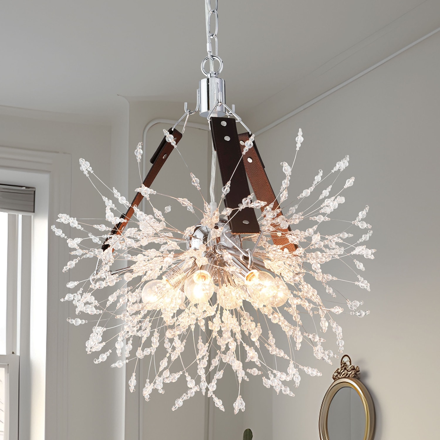 Elevate Your Home with Dazzling Radiance: The 6-Light Chandelier in Chrome Finish with Clear Glass Bead and Dark Leather Accents.