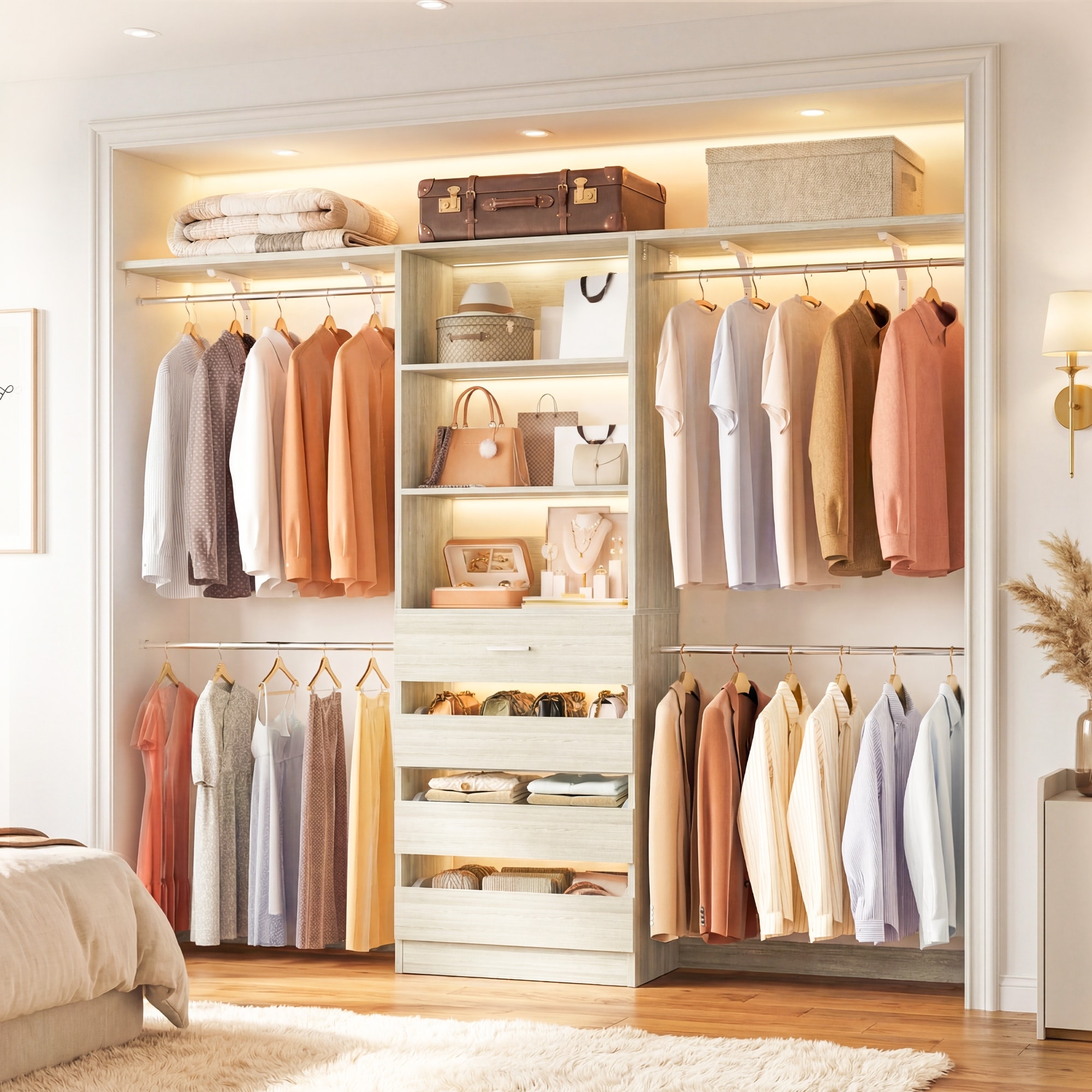 Transform Your Closet into a Boutique-Style Haven! Unlock 500+ item capacity with this industrial-strength 3-piece system: 2 drawer towers + corner shelf unit. Features 18+ shelves, 6 adjustable rods, and 2 large drawers for suits/shoes/accessories.