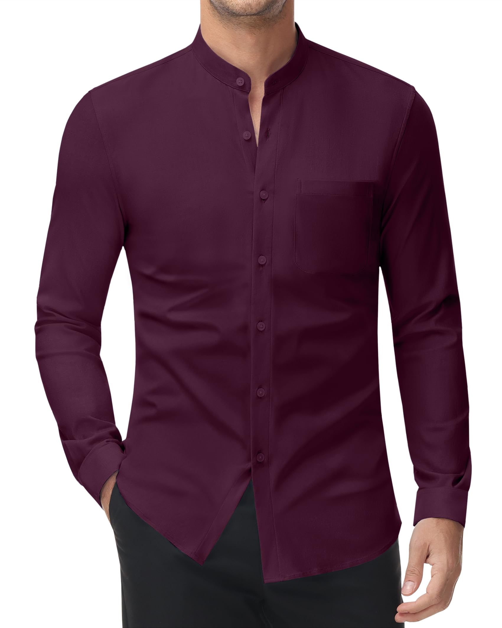 DEMEANOR Men's Collarless Dress Shirt Banded Collar Long Sleeve Button Down Shirts Stretch Formal Tops with Pocket