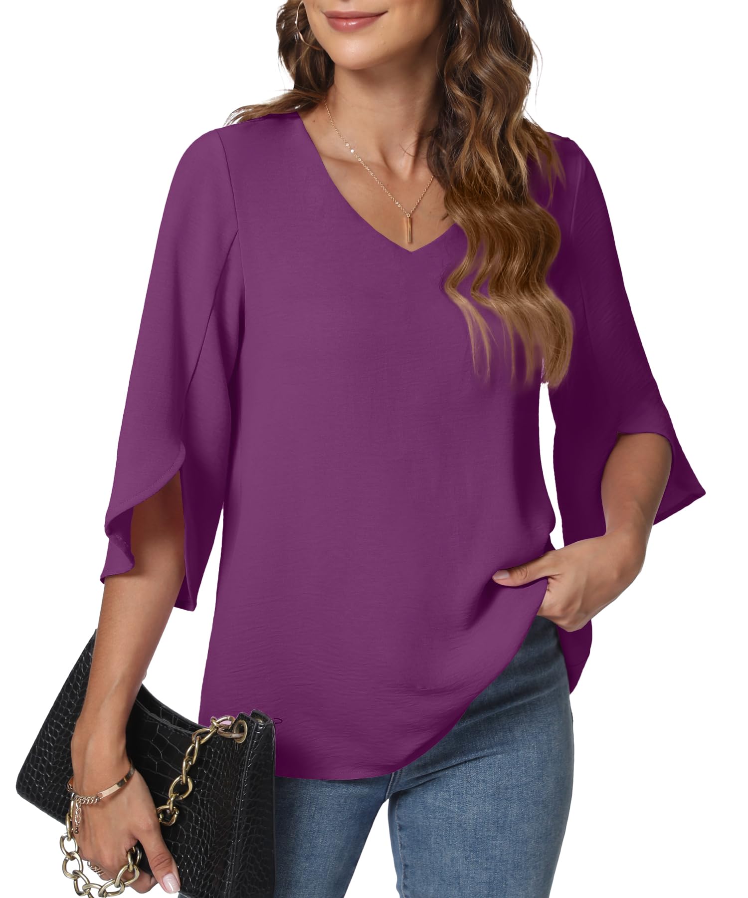 KUOTAI Womens Blouses Dressy Casual Summer Tops Work Business Shirt 3/4 Bell Sleeve Office Clothes V Neck Tunic