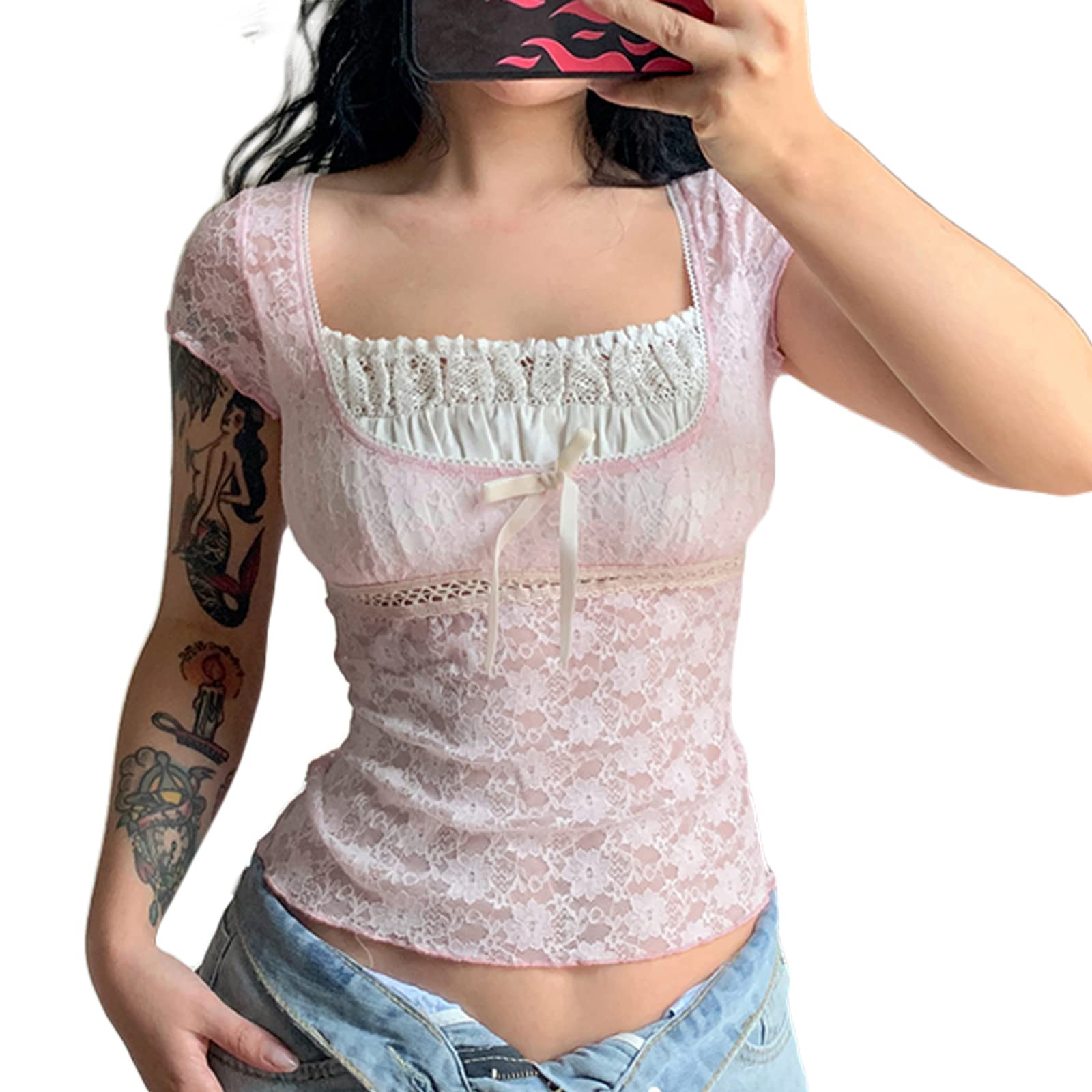 Women Fairy Grunge Y2k Shirts See Through Square Neck Lace Patchwork Tops Vintage Goth Aesthetic Clothing