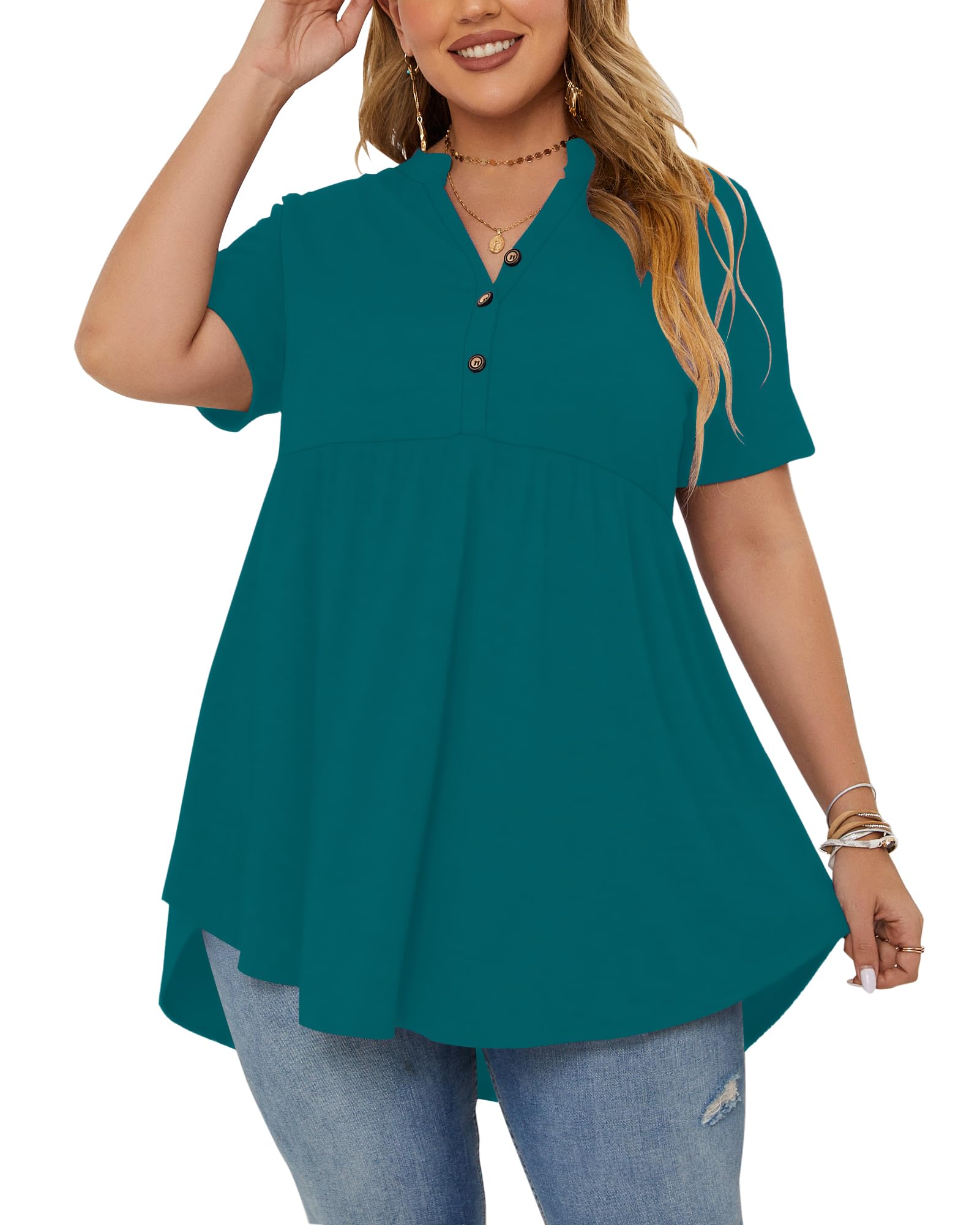 PLOKNRD Women's Plus Size Tops Short Sleeve Henley V Neck Button Up Flowy T Shirts Tunic Loose Blouses