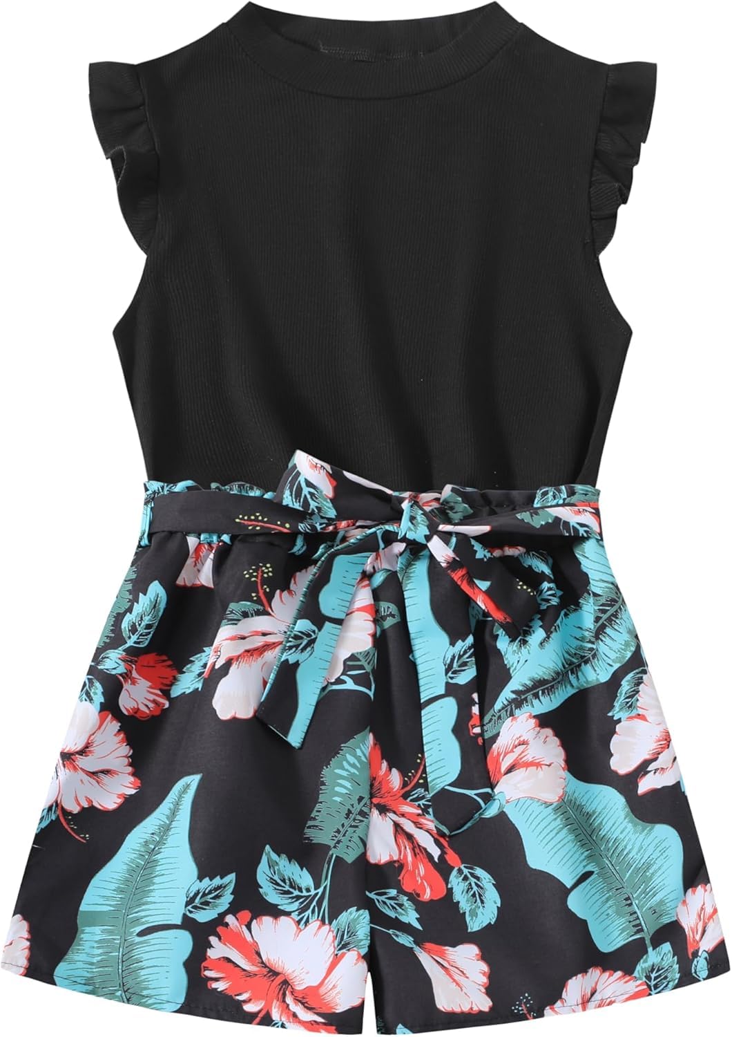 Eymitory Girls 2 Piece Outfit Summer Short Sets Tee Top T-shirt and Shorts with Belt Floral Print Clothing Sets