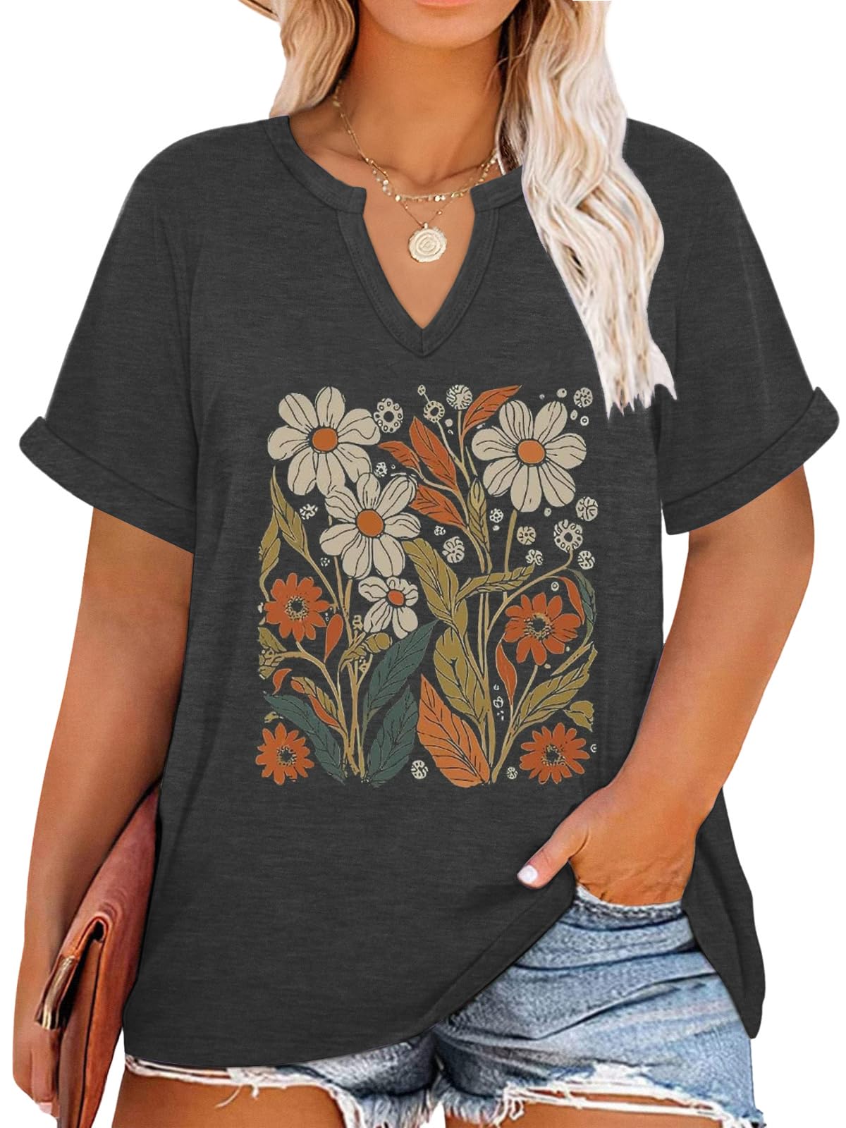 Chulianyouhuo Women's Plus Size Tops Boho Floral Graphic T Shirt V Neck Casual Short Sleeve Loose Fit Basic Tee Blouses