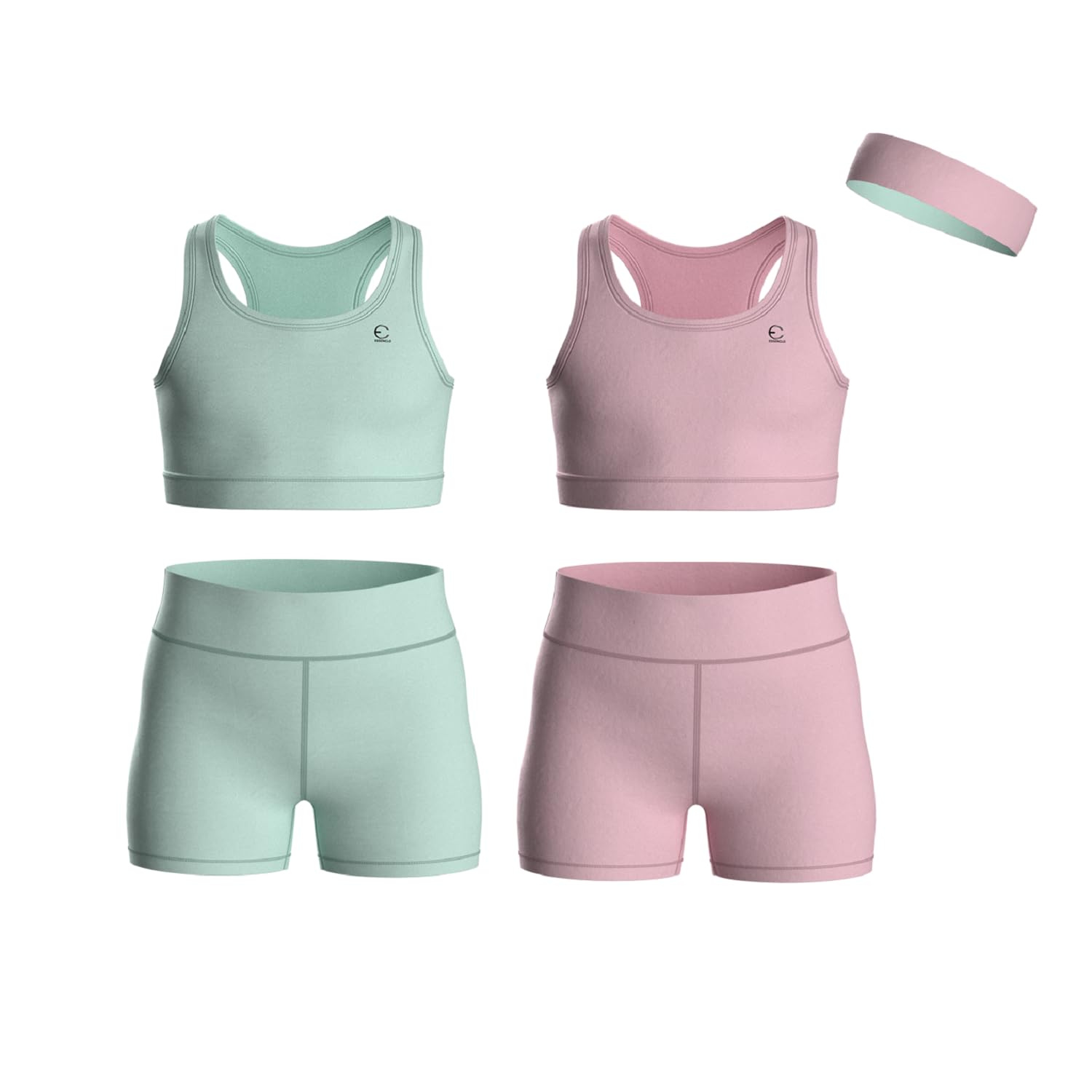 5-PIECE GIRLS ATHLETIC SET: This Essenclo Girls Athletic Clothing Set includes 2 pairs of biker shorts, 2 sleeveless tank tops, and a reversible headband from sizes 3-16. Ideal for active kids activities like gymnastics, volleyball, yoga, dance, cheer, and everyday casual wear. LIGHTWEIGHT & BREATHA