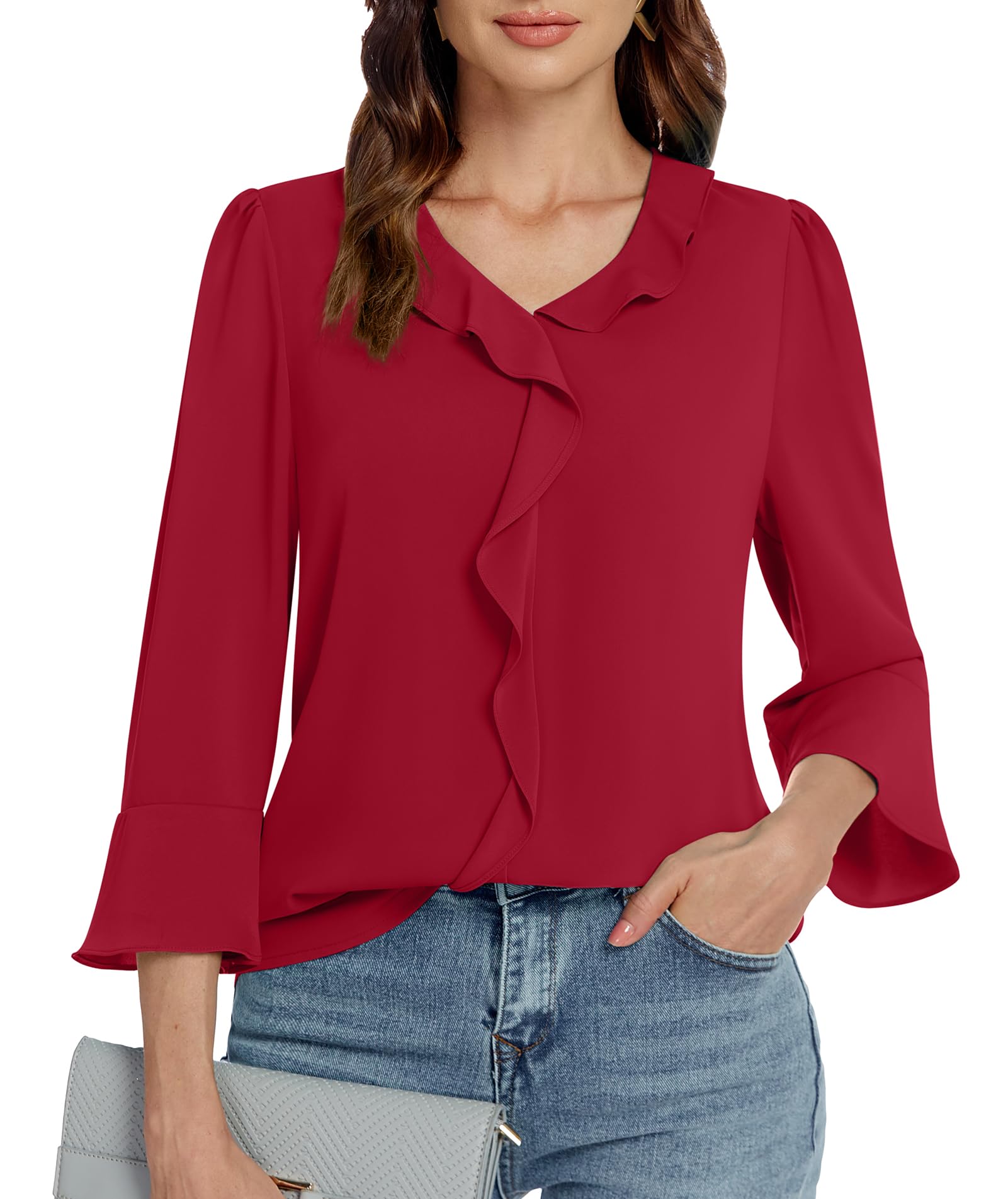Funlingo Womens 3/4 Length Sleeve Tops V Neck Dressy Casual Blouses Tunic Trendy Business Office Ruffle Work Shirts