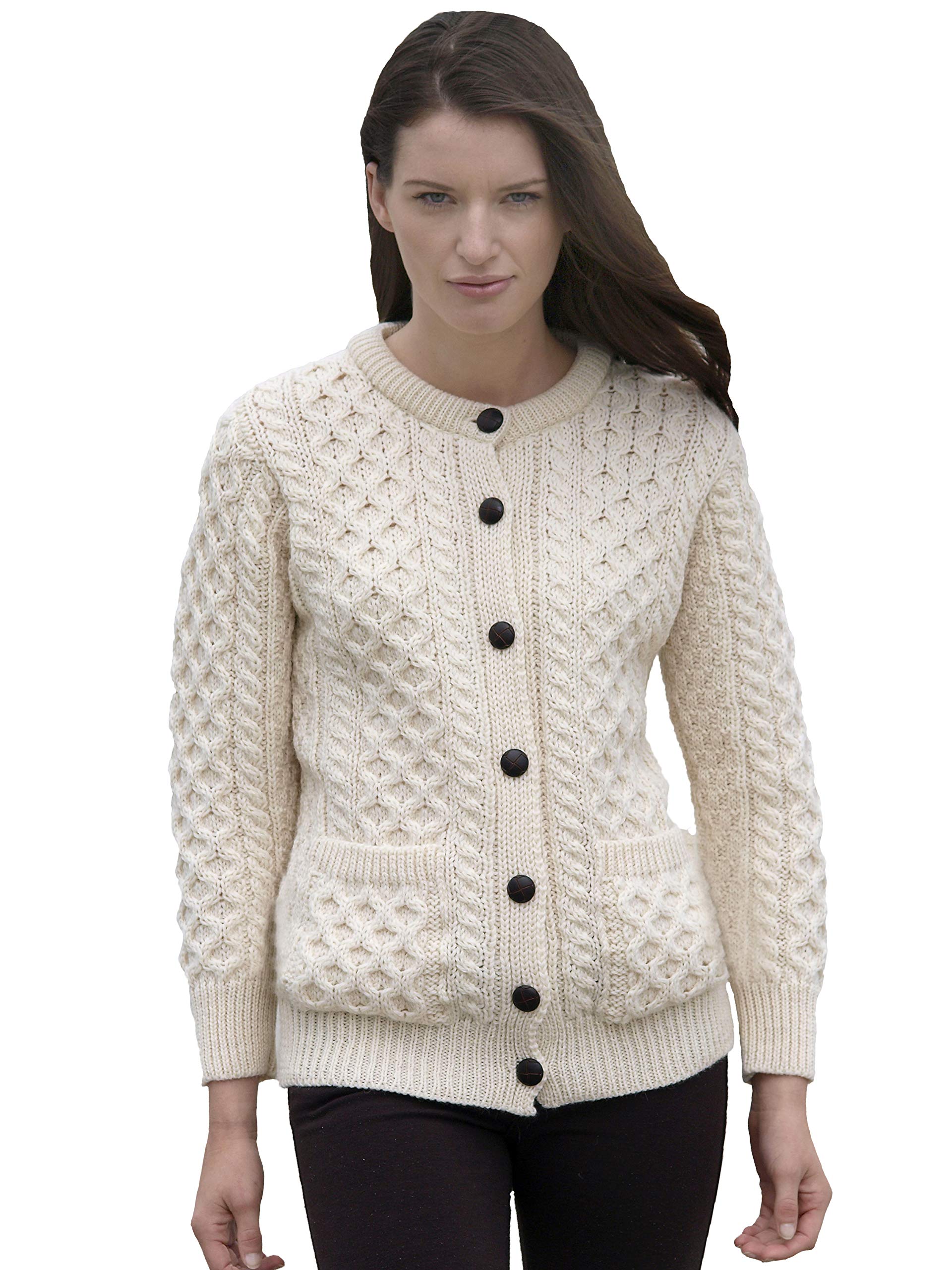 Aran Crafts Women's Cable Knit Soft Buttoned Lumber Jacket (100% Merino Wool)