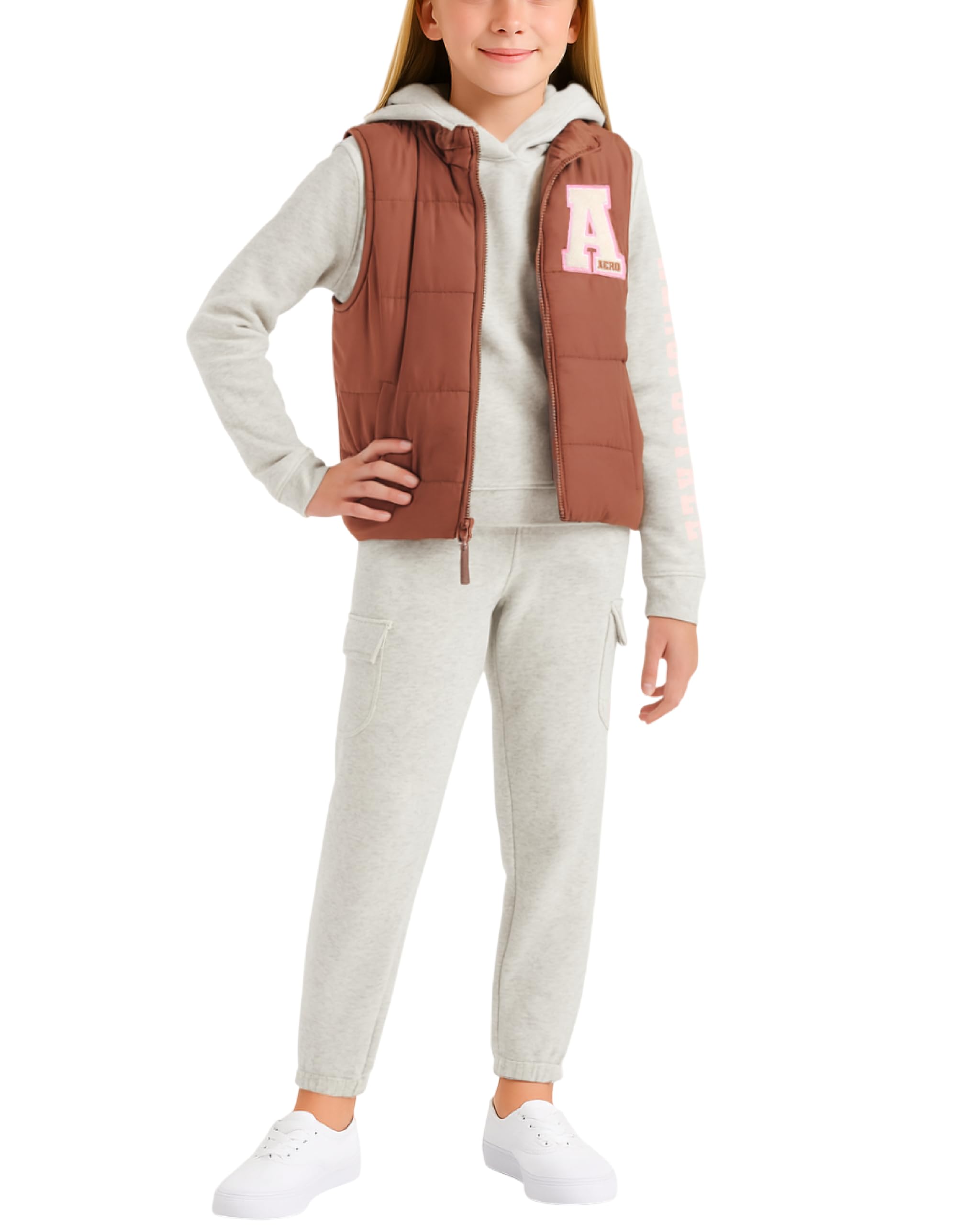 AEROPOSTALE Girls Joggers Set - 3 Piece Puffer Vest, Pullover Hoodie and Cargo Jogger Sweatpants for Girls (Sizes: 4-16)
