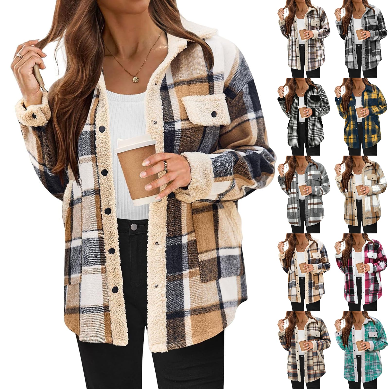 Sherpa Jacket Women Warm Fuzzy Plaid Shacket Casual Comfy Button Down Fleece Jacket Loose Fit Fall Winter Coats